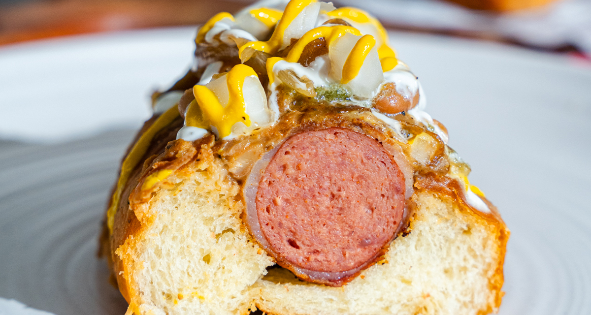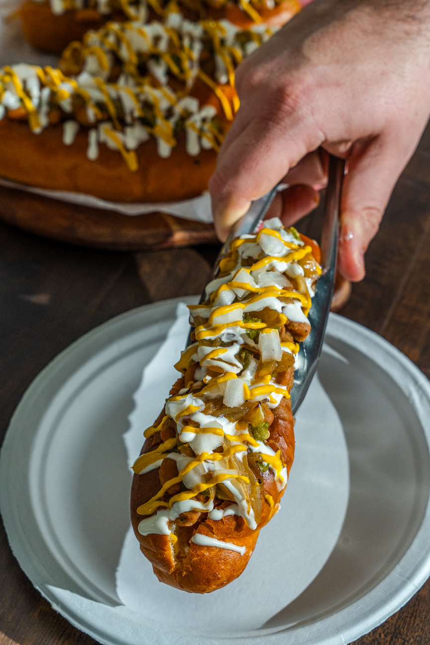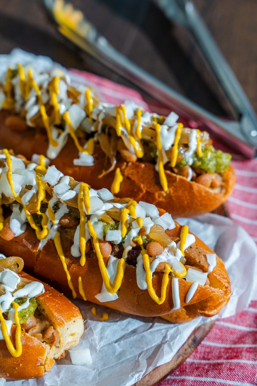 - Assemble first with the hot dog, then a scoop of beans, topped with your homemade hot sauce, then reserved caramelized onions, then crema, raw onion, and a drizzle of mustard if you like mustard.