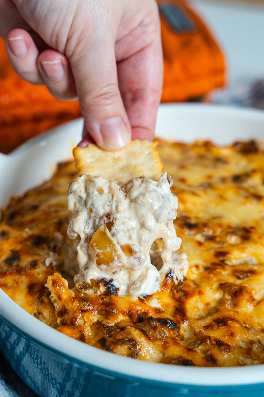 I have long been a French Onion Dip aficionado but I’ve always liked it one way and one way only — cool and creamy and made with a packet of French onion mix. (Specific brands only.) Friends, I didn’t know what I was missing. See, this French Onion Dip is baked and it’s a whole different level of delicious. Here, you caramelize your own onions (worth it), and mix all your flavors from your spice drawer yourself (easy), and the results are outstanding. They are hot, bubbly, sweet, creamy, and comforting results. Will I ever leave my good ol’ standard packet of French onion mix style dip behind? Never. But will I be turning to this for those special occasions when I need a leveled up version from now on? Absolutely.