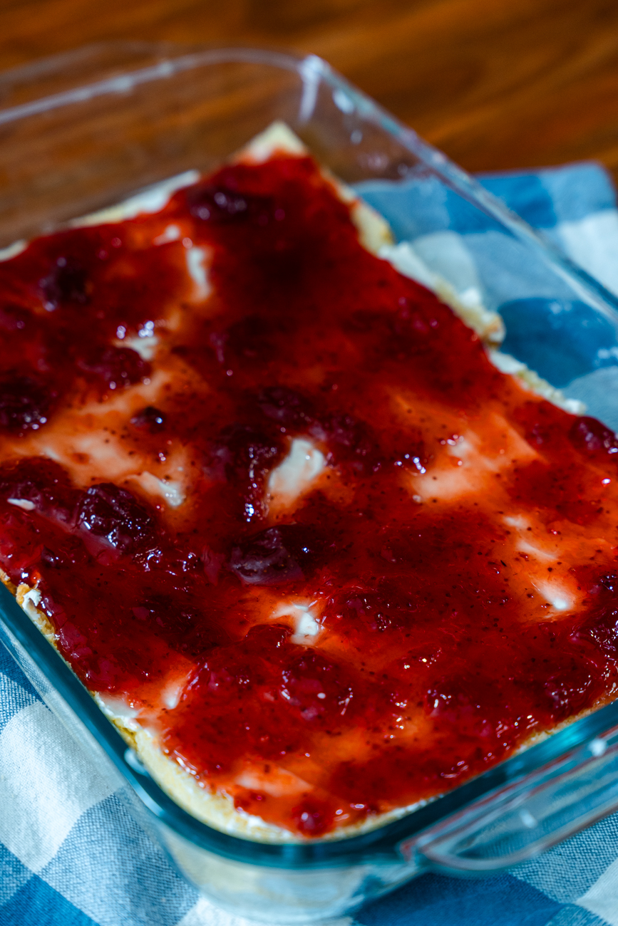 - spread the cream cheese over the surface of the bread layer, then repeat with the jam.