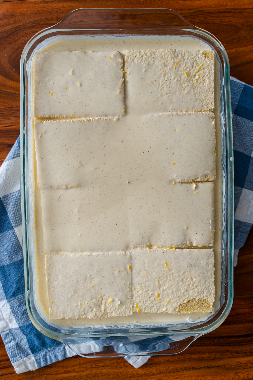 - Pour the liquid mixture over the surface of the bread and allow to soak in for 3-5 minutes.