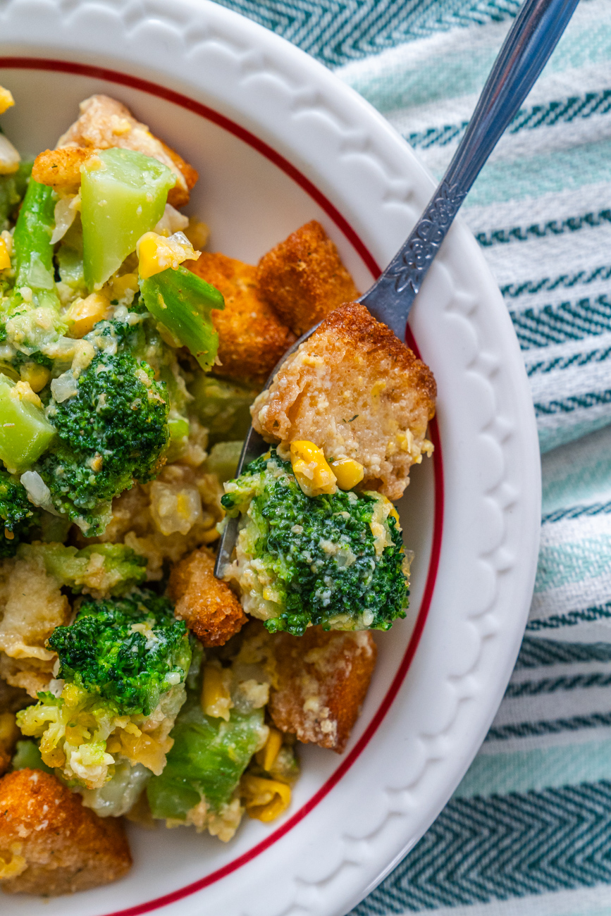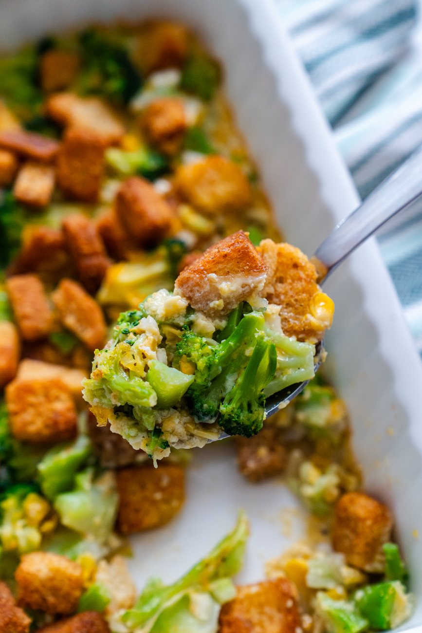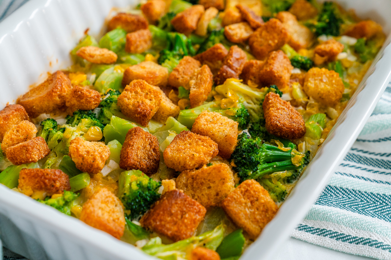 - Add the drained broccoli to the bowl with the corn, along with 1 cup of the crouton mixture, saving the rest for topping. Stir to combine, then transfer to the prepared baking dish. Top with reserved croutons and bake for 30-35 minutes. Enjoy!