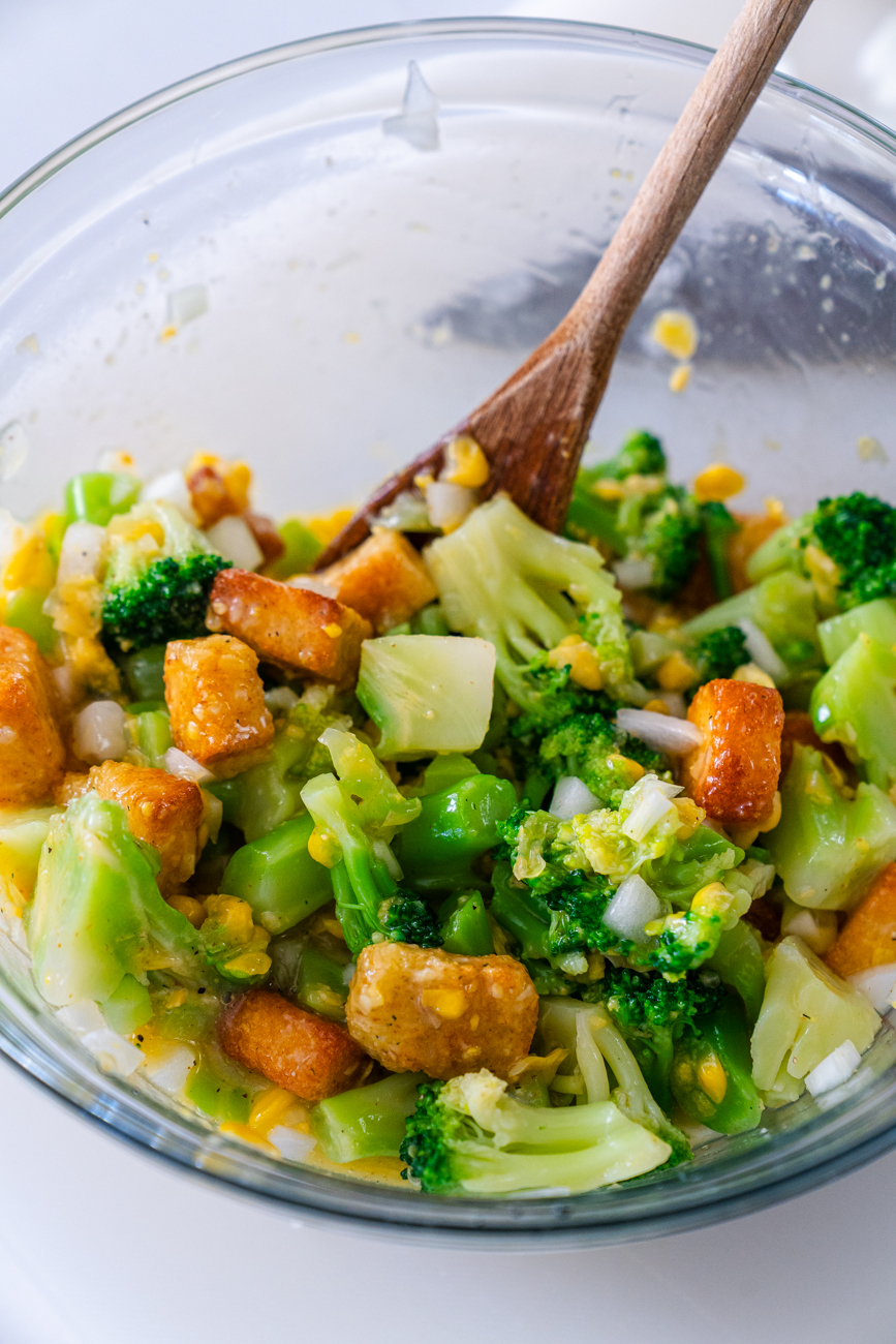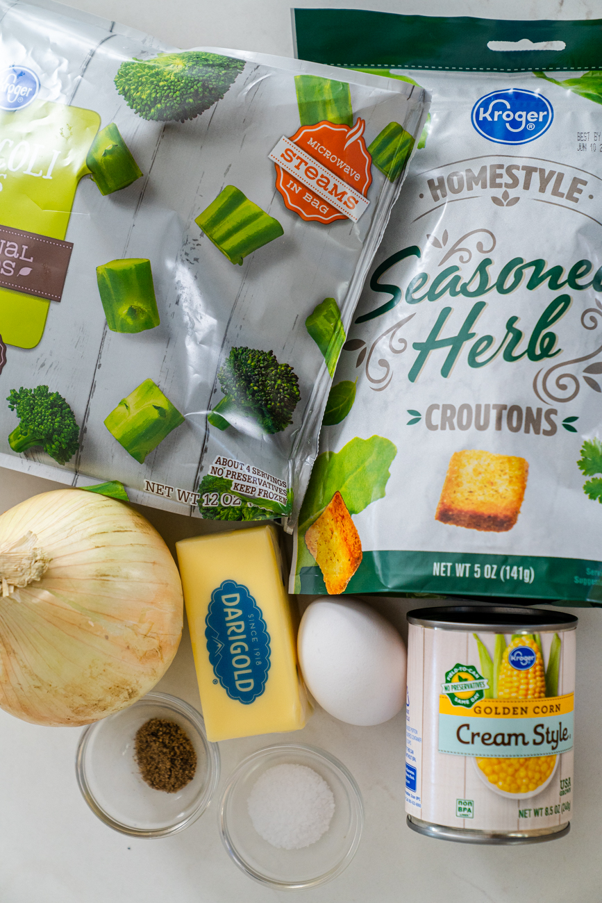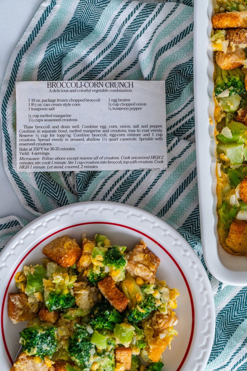 - Add the drained broccoli to the bowl with the corn, along with 1 cup of the crouton mixture, saving the rest for topping. Stir to combine, then transfer to the prepared baking dish. Top with reserved croutons and bake for 30-35 minutes. Enjoy!