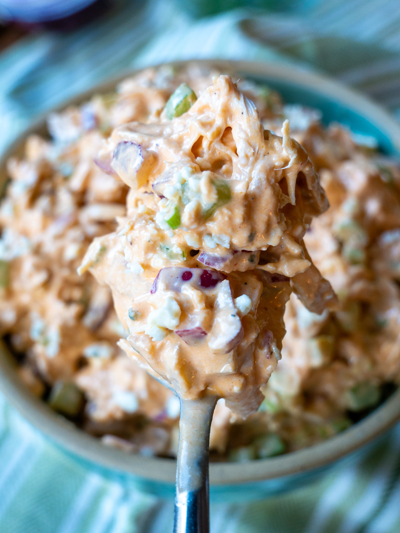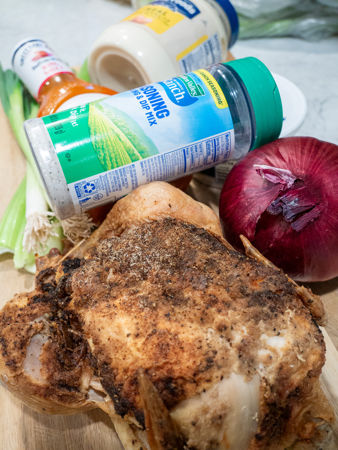 - In a bowl, combine the chicken, wing sauce, mayo or yogurt, ranch seasoning, red onion, celery, green onion, and blue cheese.