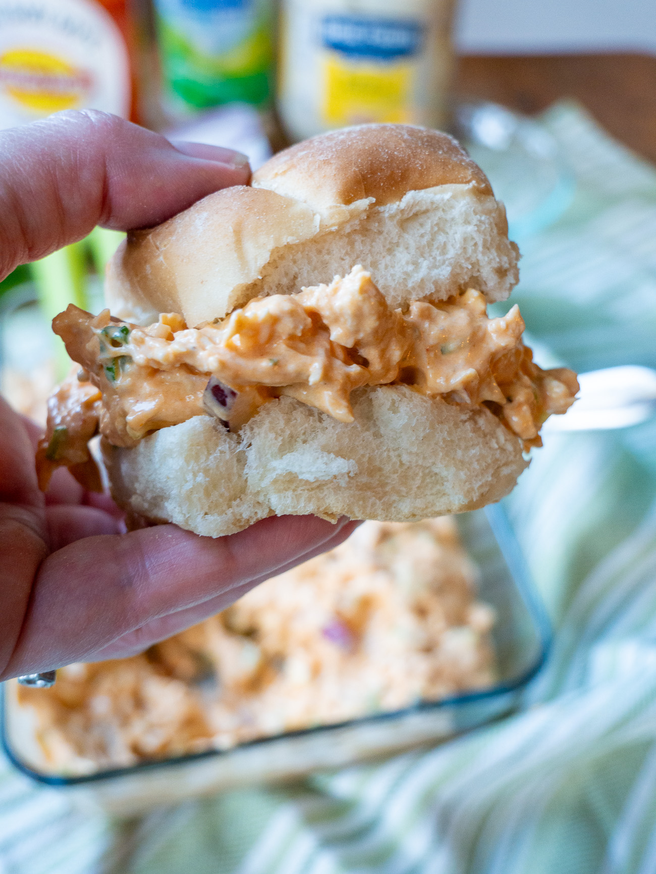 This is a delicious chicken salad that keeps really well when made ahead. It’s creamy, tangy, and has just a little kick! People tend to love this at parties and potlucks because it’s great scooped up with celery or crackers (though it makes great little sliders too). Enjoy!