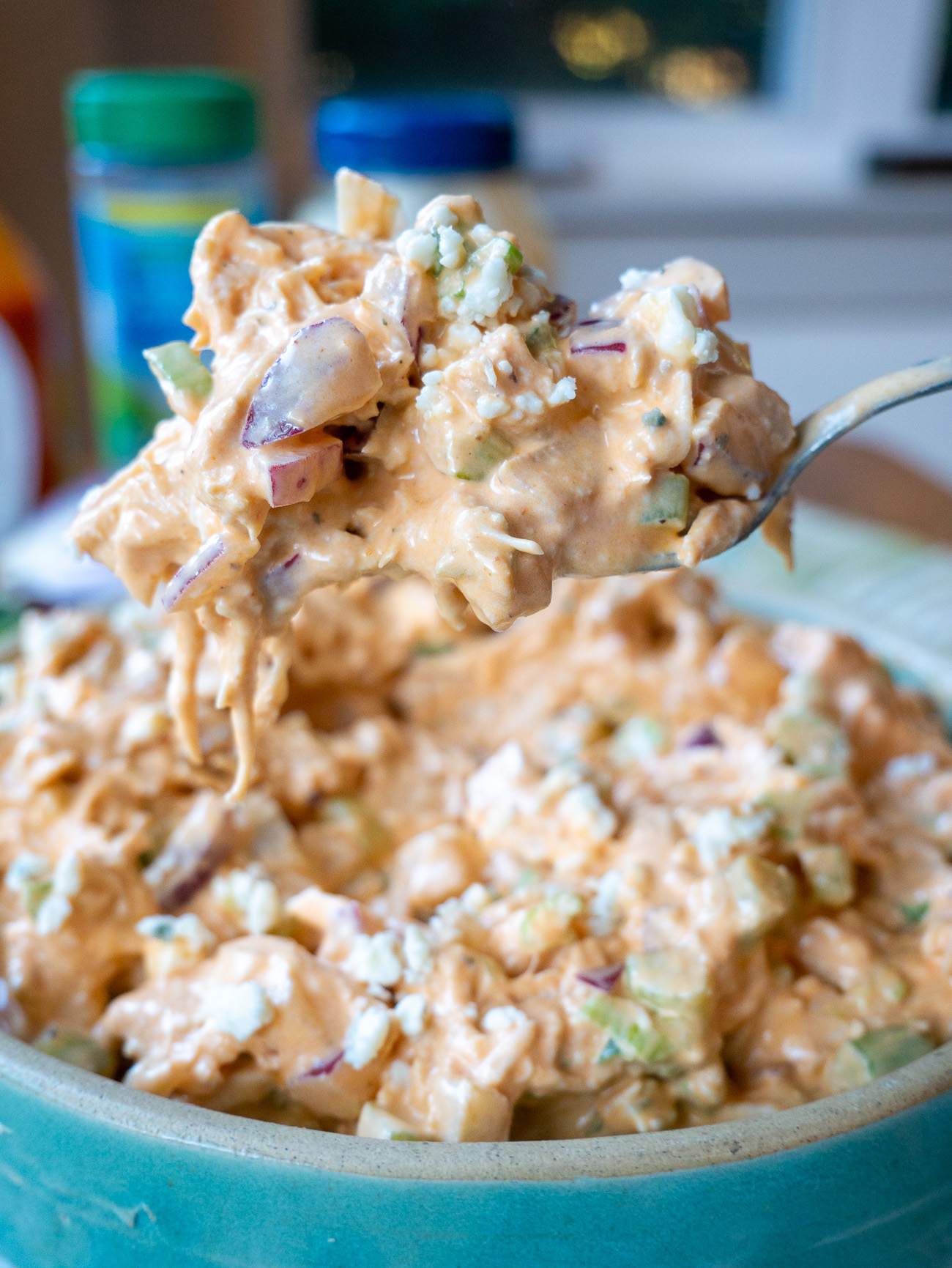 Take that chicken, take those veggies, and stir them together with some buffalo wing sauce, mayo or yogurt, some ranch seasoning, and just a bit of blue cheese. This is definitely a place where you want to adjust things to taste. If you like it a little spicier, add more buffalo sauce. If you want it on the milder and creamier side, opt for more mayo. And if you’re not big on blue cheese, you can use a milder option like gorgonzola. (Though at a mere two tablespoons, the blue cheese here really fades into the background.)
