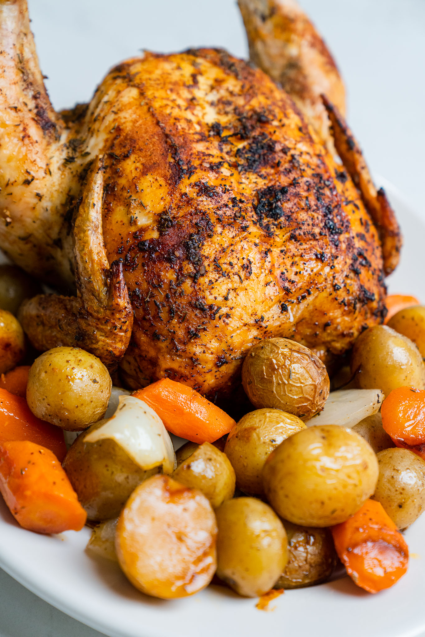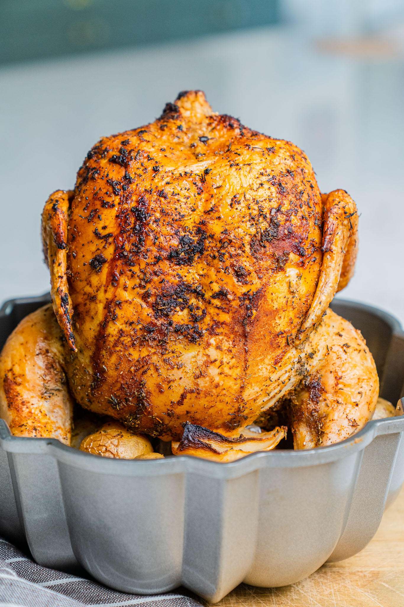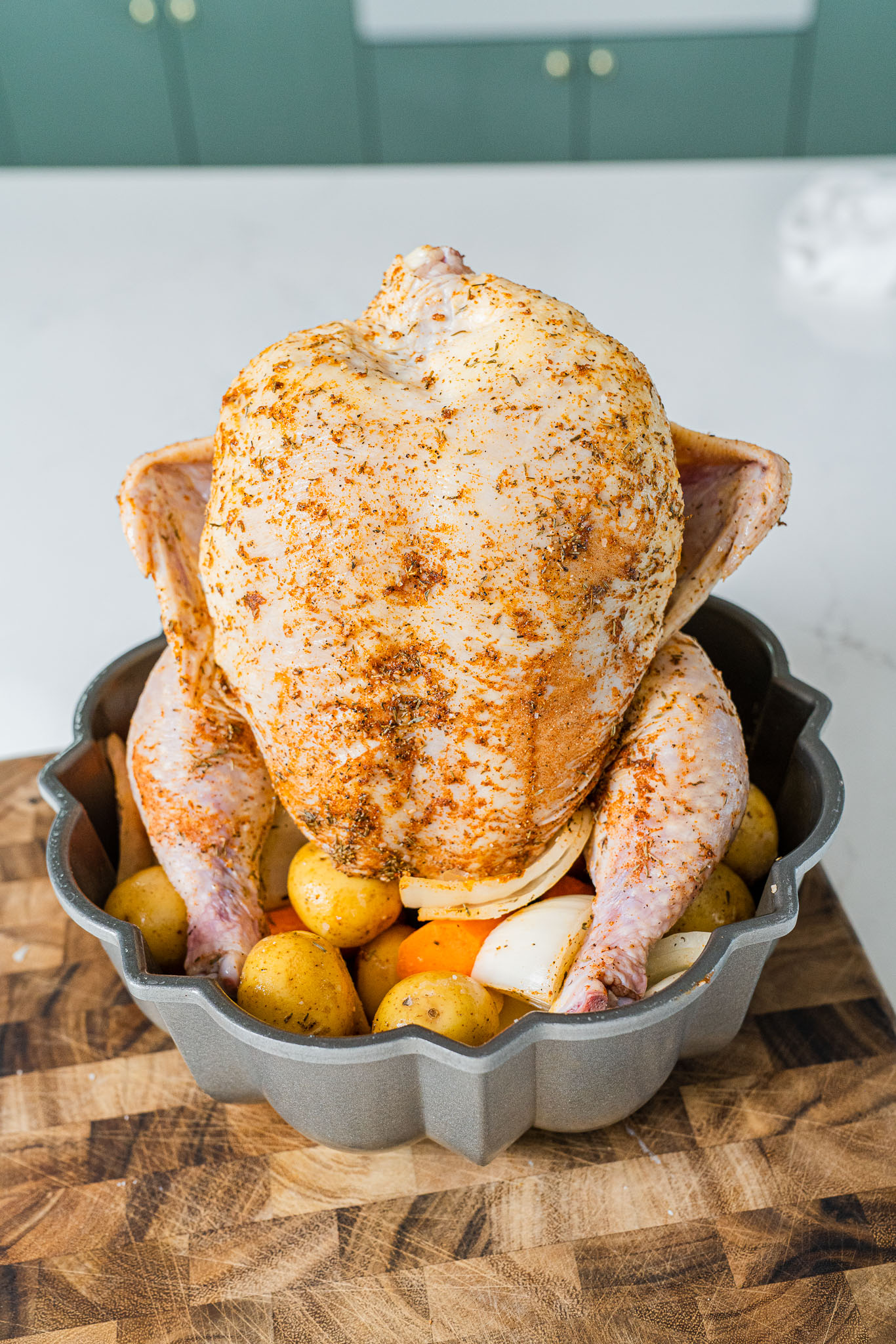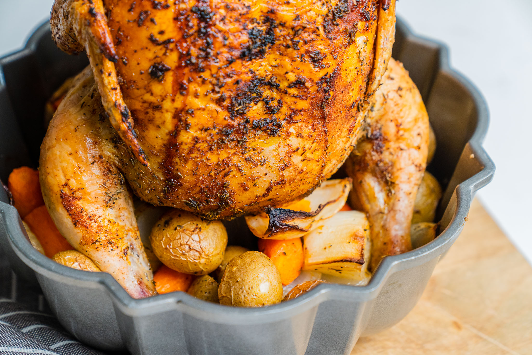 You might be wondering why you would want to cook chicken in a bundt pan? It’s a great question. Roasting a chicken in a roasting pan or even a cast iron skillet works perfectly well, so why switch things up? Well, think of Bundt Pan Chicken as DIY rotisserie chicken. Because the bird gets 360° air circulation in the oven, the skin gets crispy but the meat stays juicy. And those vegetables beneath it? Well, they catch ALL that flavor from above.