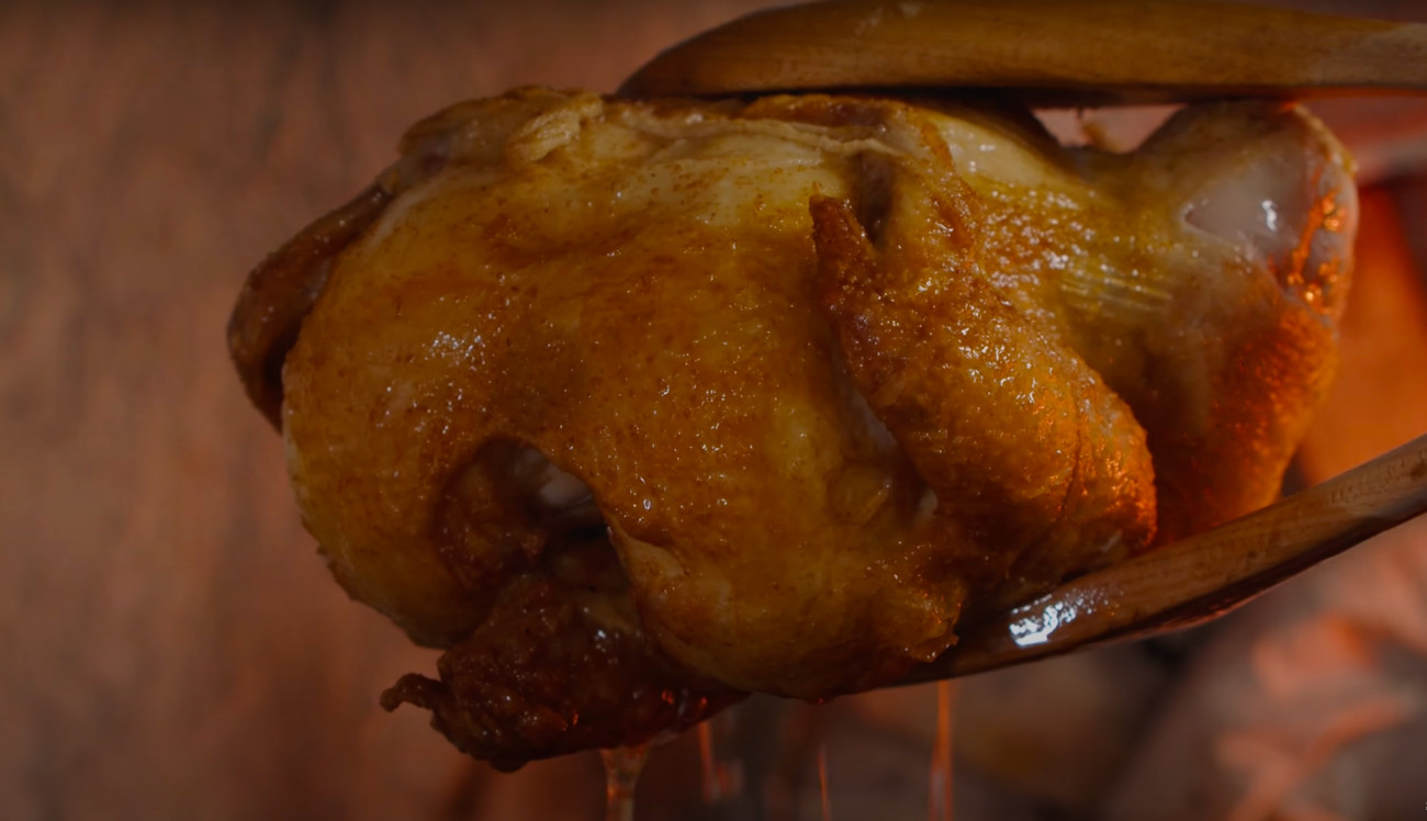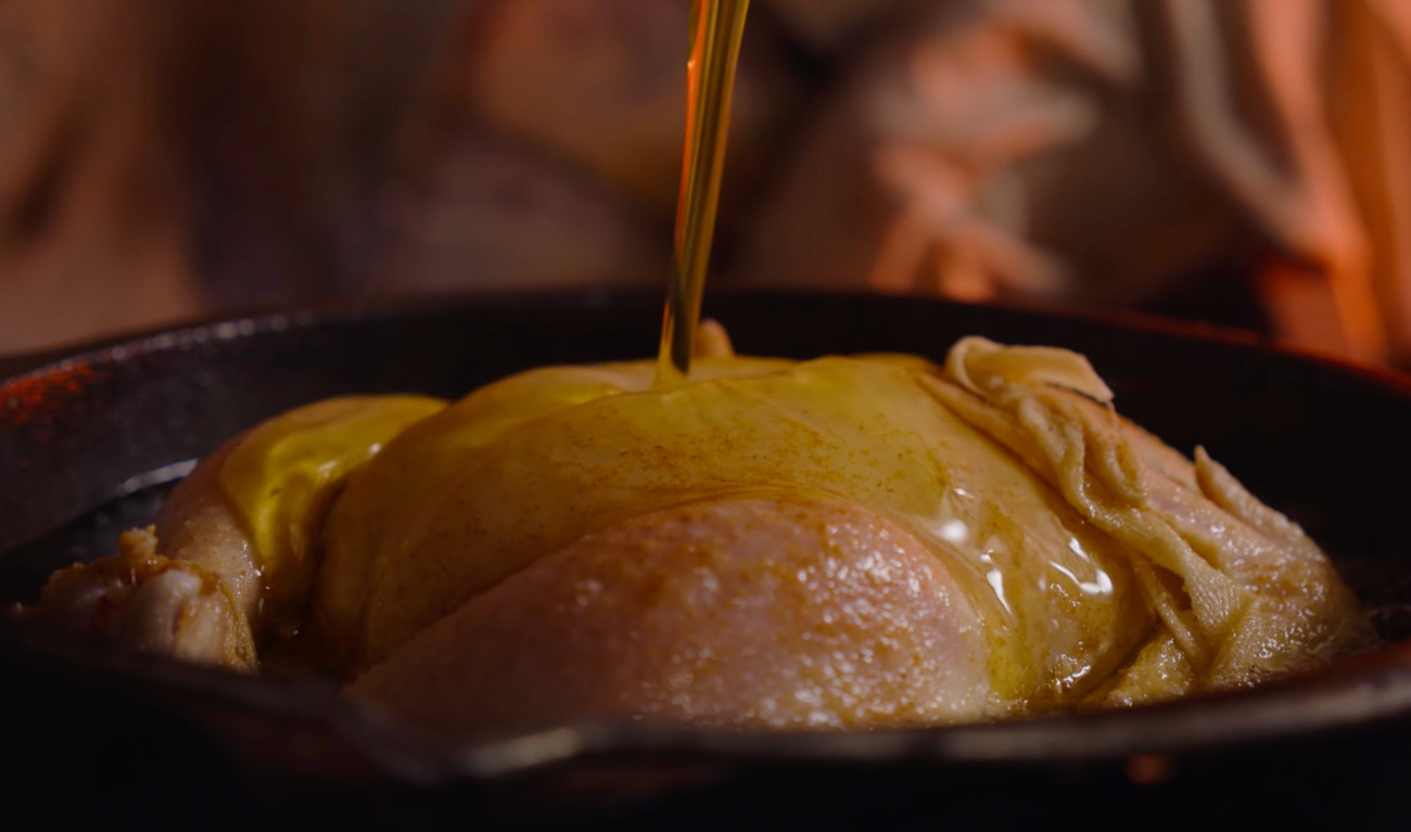 After you remove the bird you garnish with, no surprise, some more butter. This overabundance of butter may make a gross and greasy bird, but that is not the case here. Cooking the chicken in butter makes for a soft, tender, and moist of meat, all parts of the bird are packed with flavor. It imparts moisture, not grease.