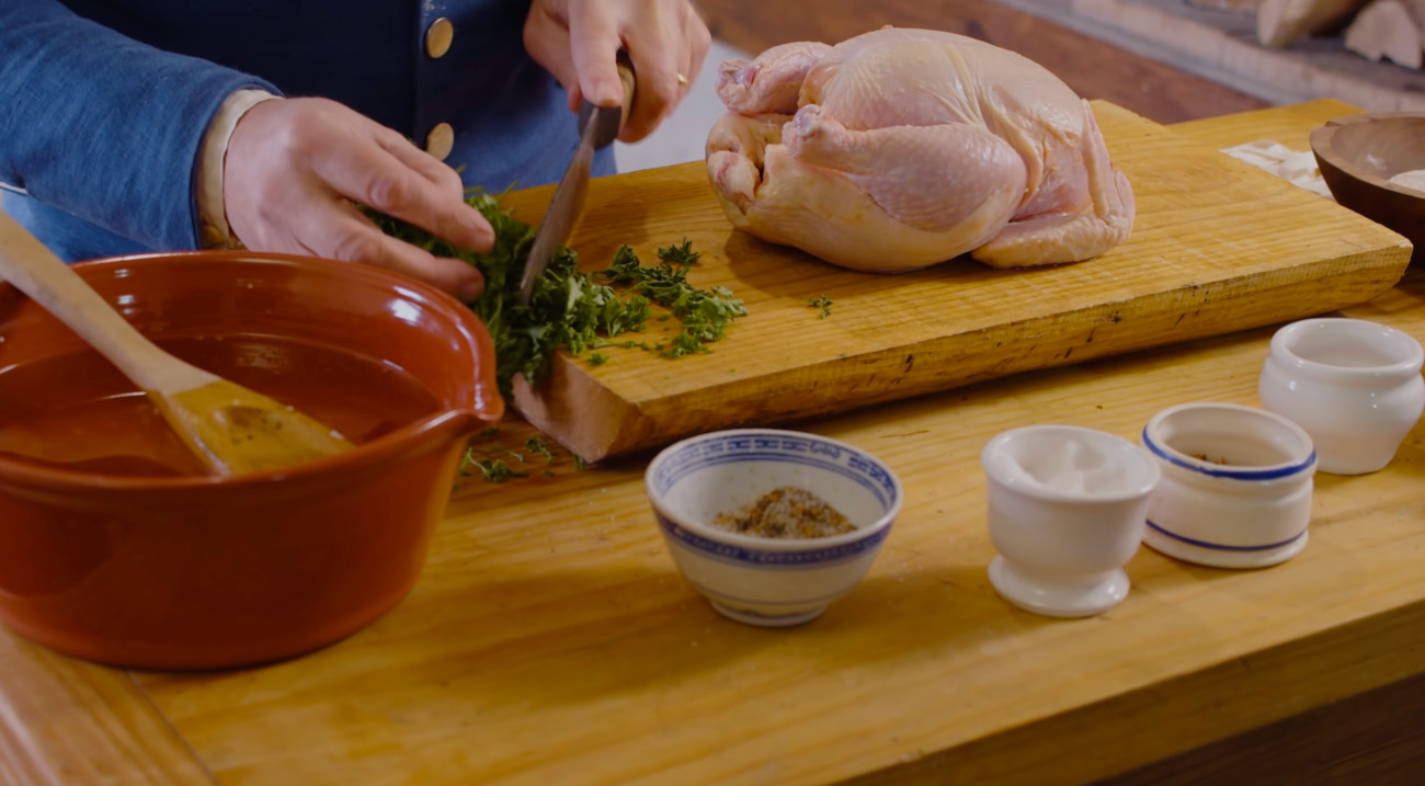 A simple spice mix goes inside the bird – salt, pepper, ground cloves, mace, nutmeg, and chopped fresh parsley. You can stuff the cavity full because this is the only seasoning (outside of the butter) that the chicken gets.