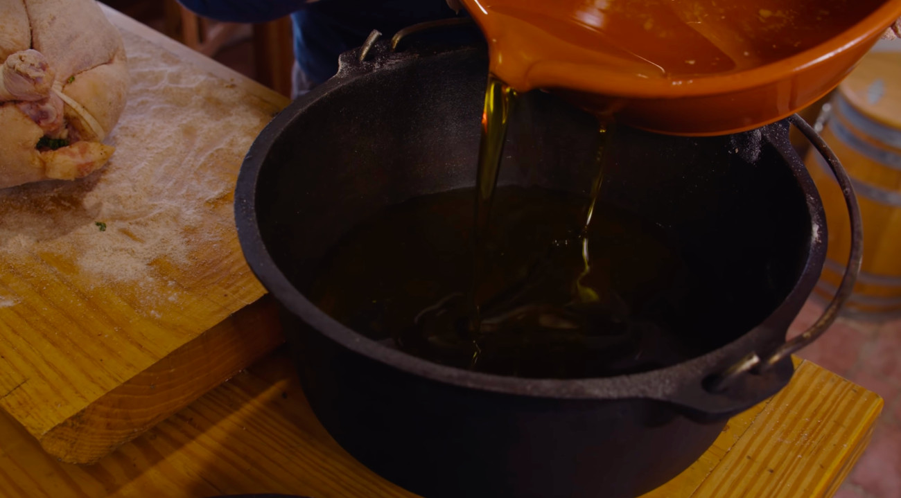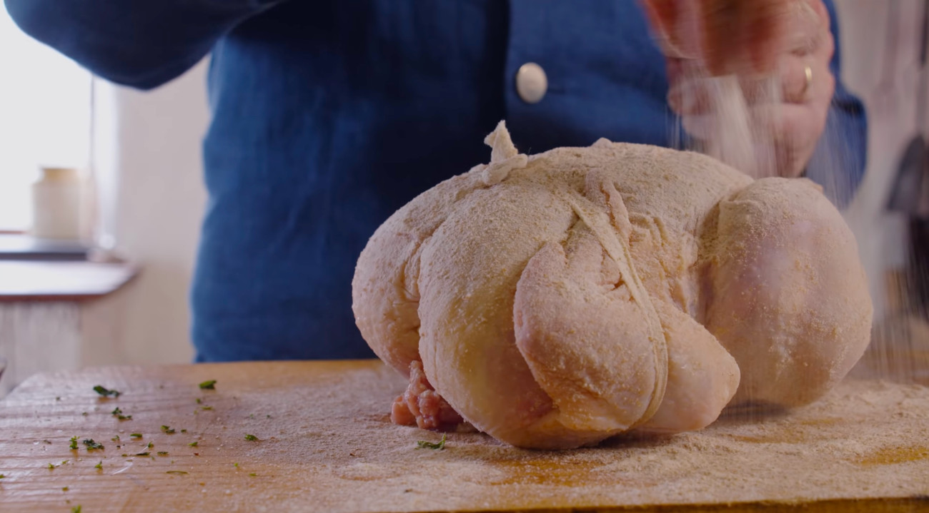 As you warm up your butter in a large pot, tie the bird’s legs and wings close to the body and coat the outside with a bit of flour. You don’t want the butter boiling but just warm enough so the flour sticks and doesn’t dissolve into the butter.