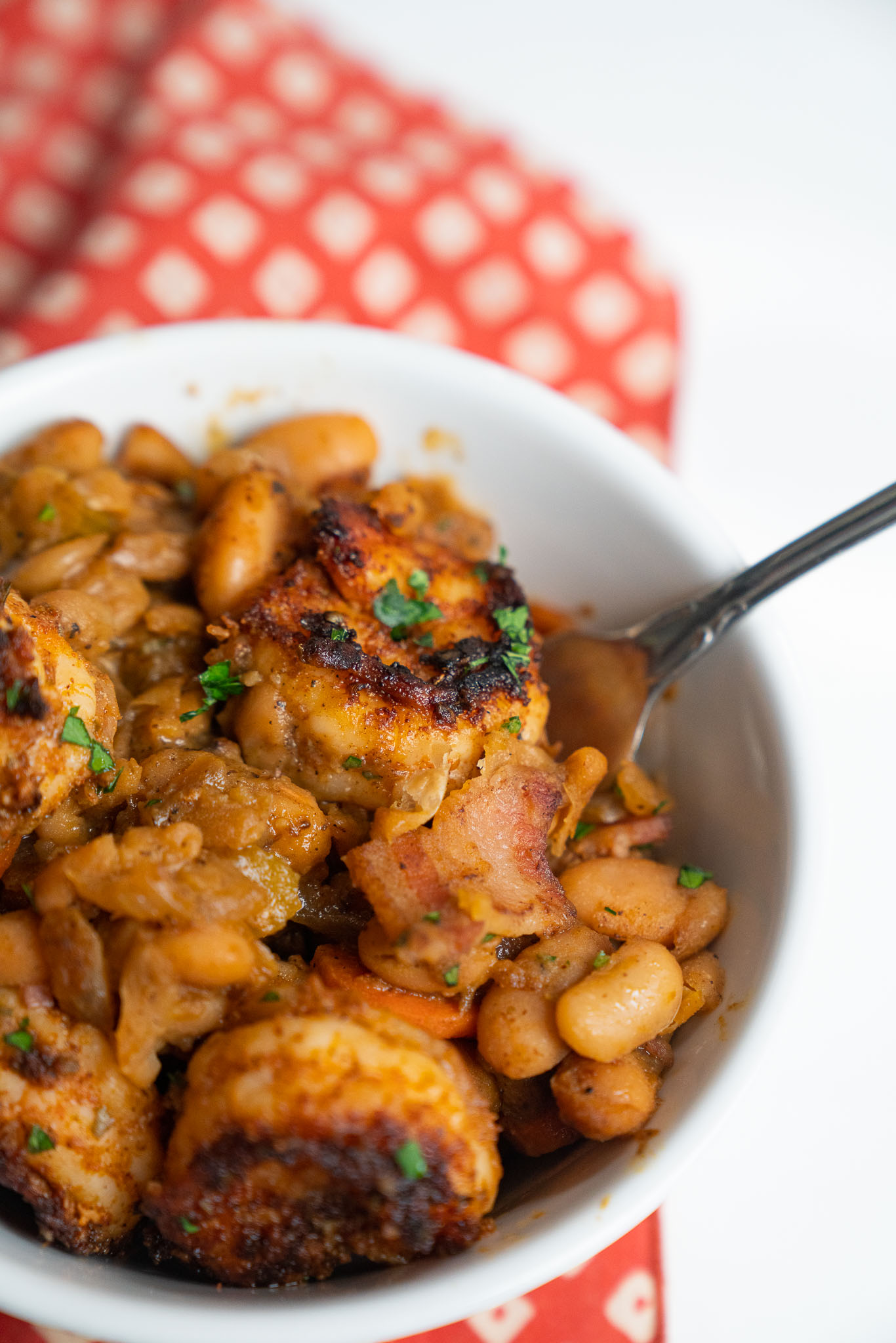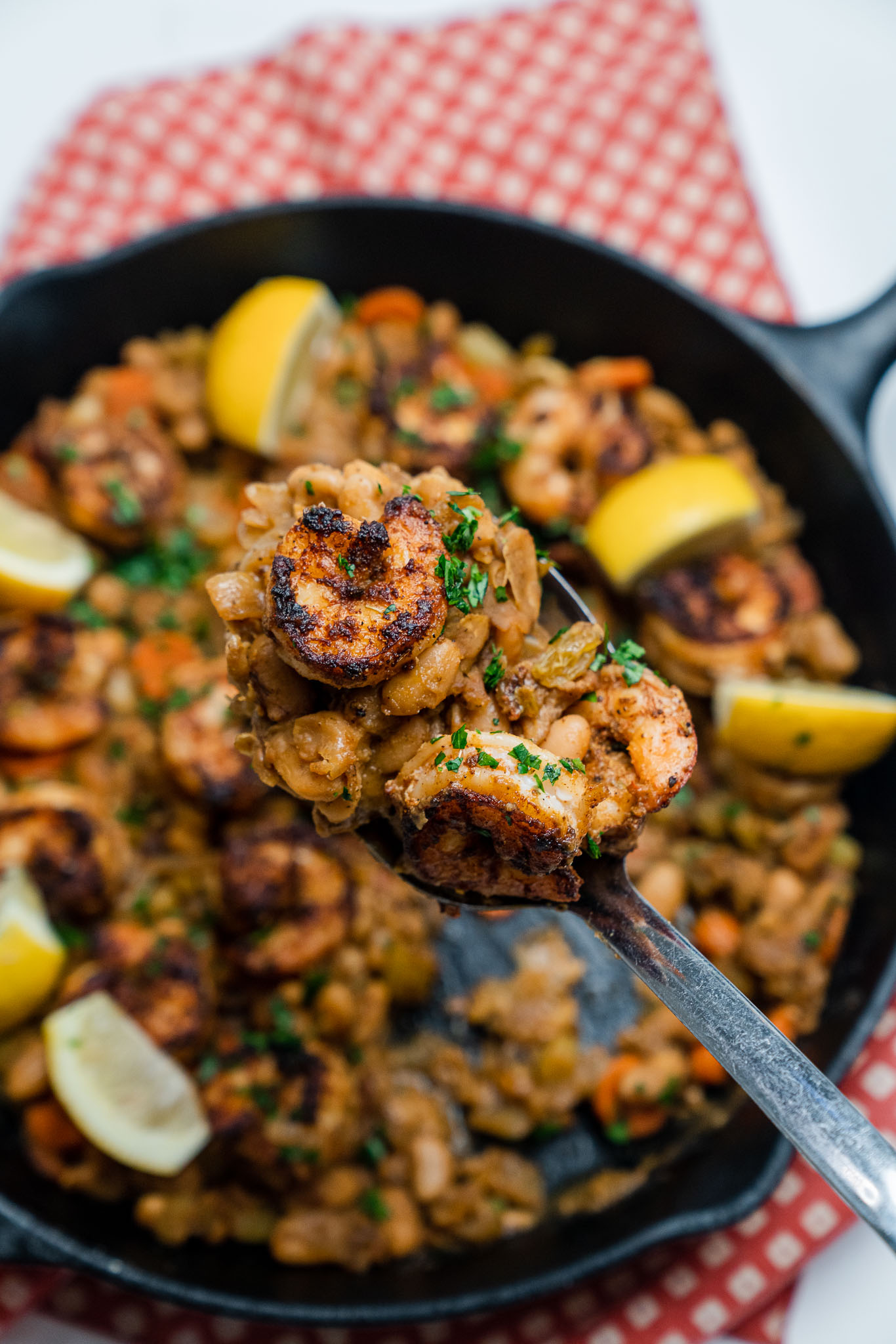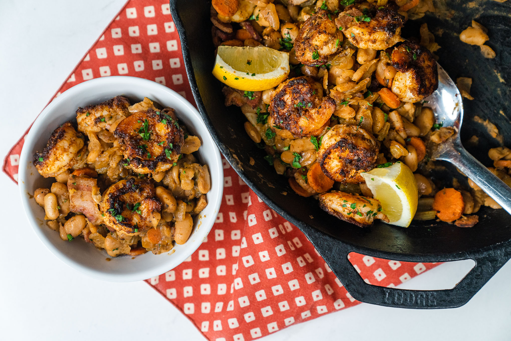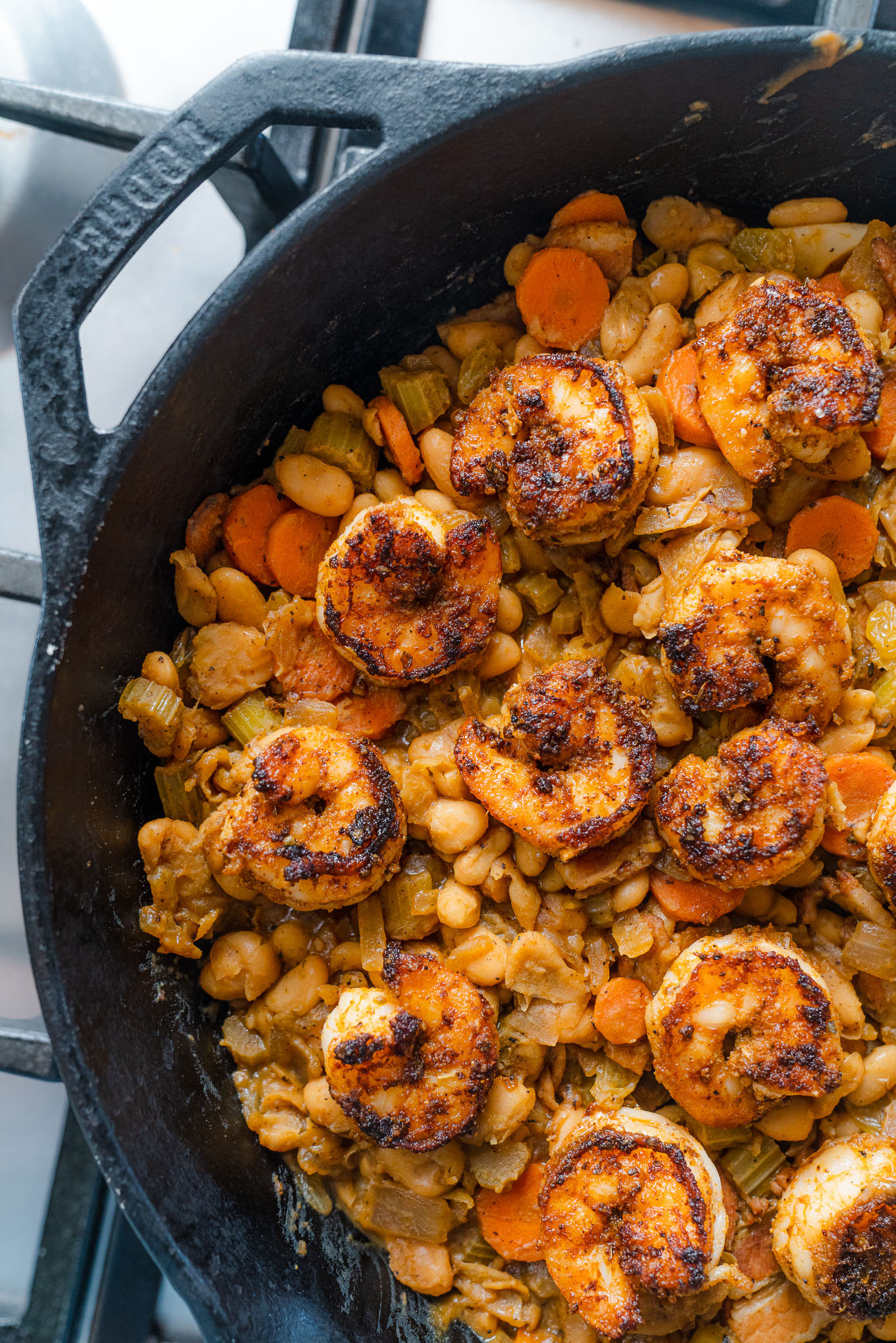 Cajun Shrimp and Beans tastes like a dish that’s been simmering away all day. The spices left in the pan from the shrimp work with the bacon and mirepoix to create tons of flavor for the beans to absorb.