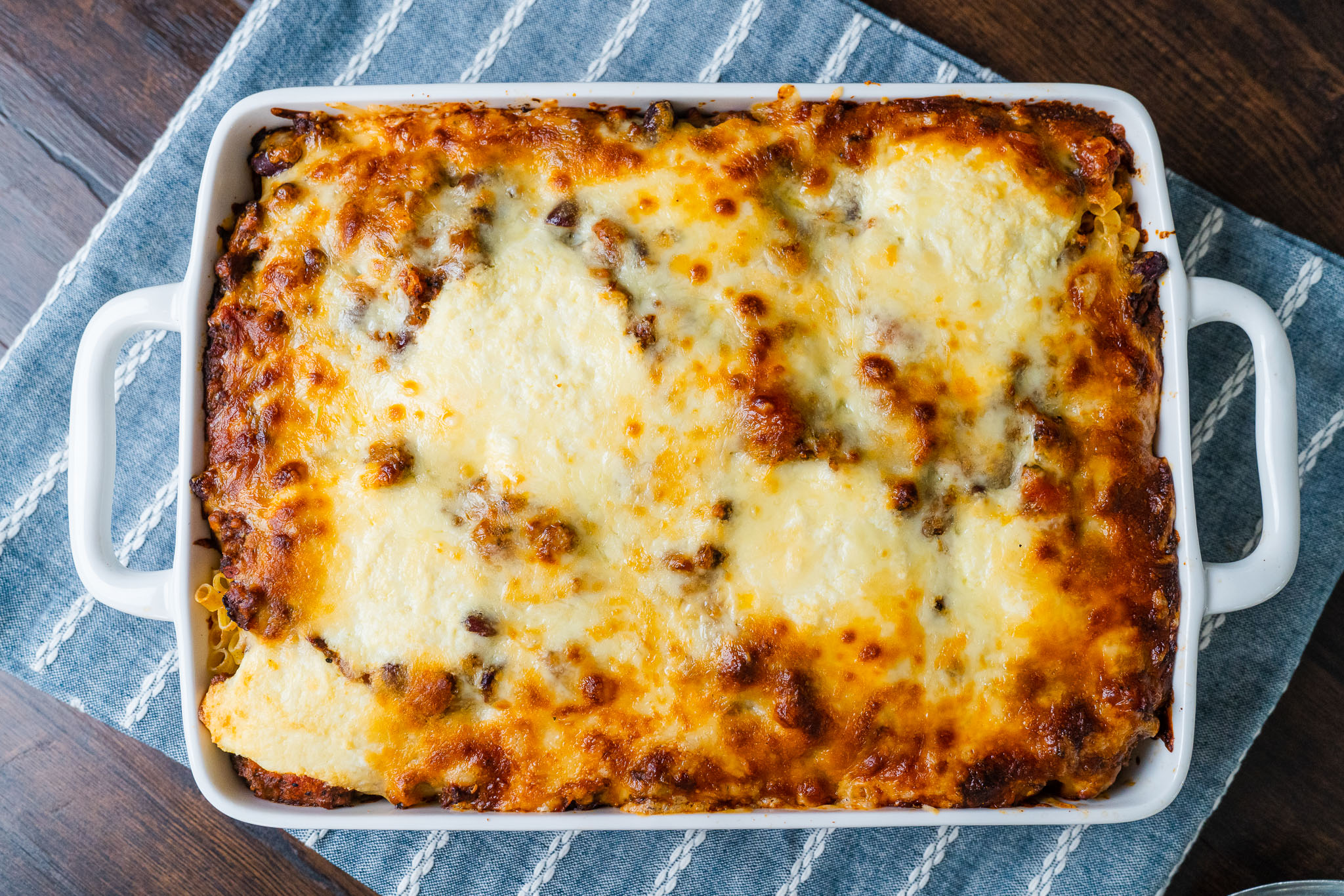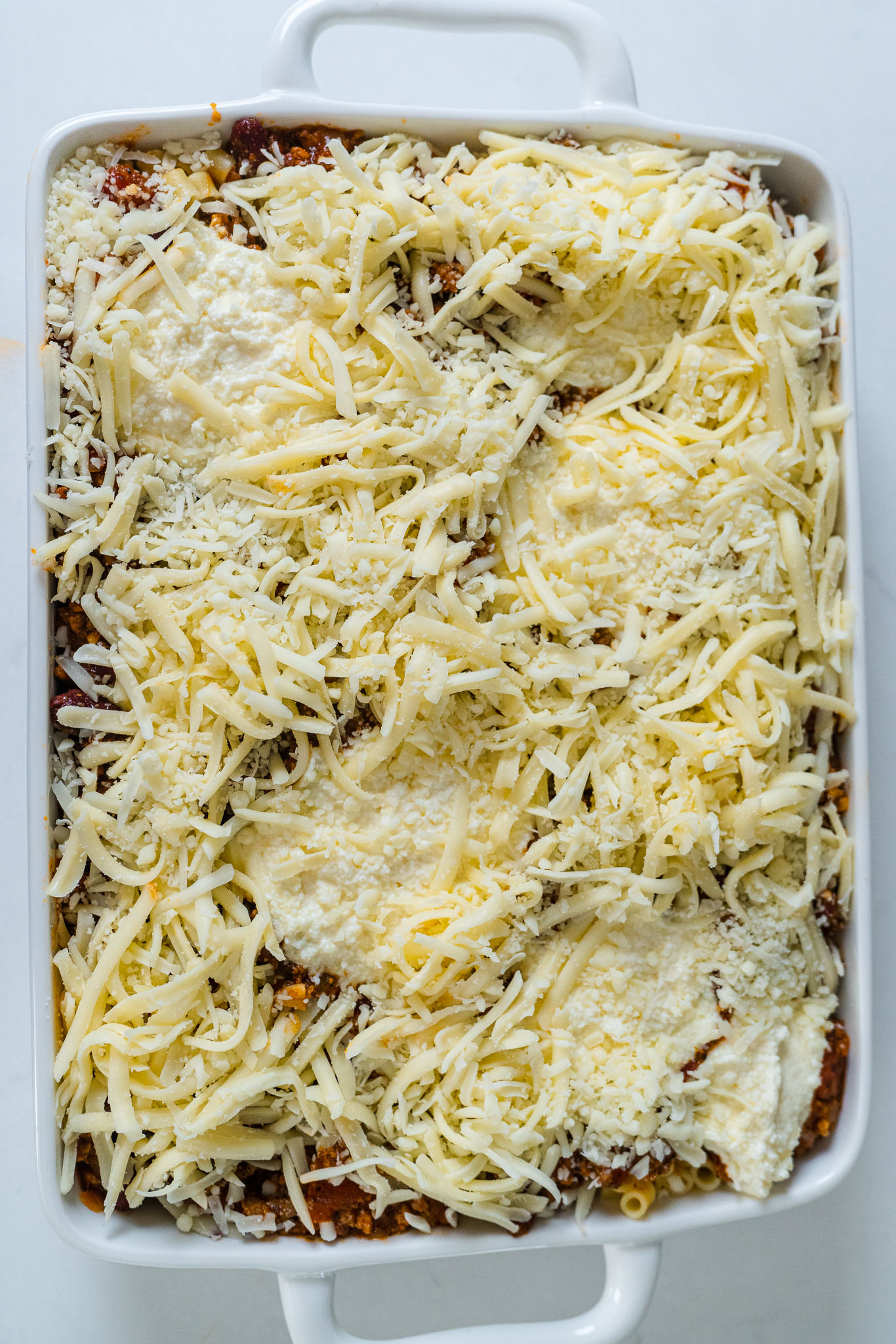 Now it’s time to throw it all together in one pan and bake it in the oven with lots of gooey cheese. Spoon over the ricotta in big scoops and slap it onto the pasta. It looks great this way, but the force helps the ricotta get into the center without mixing. Finish it off with handfuls of cheese and bake it until golden in some parts and gooey in others.