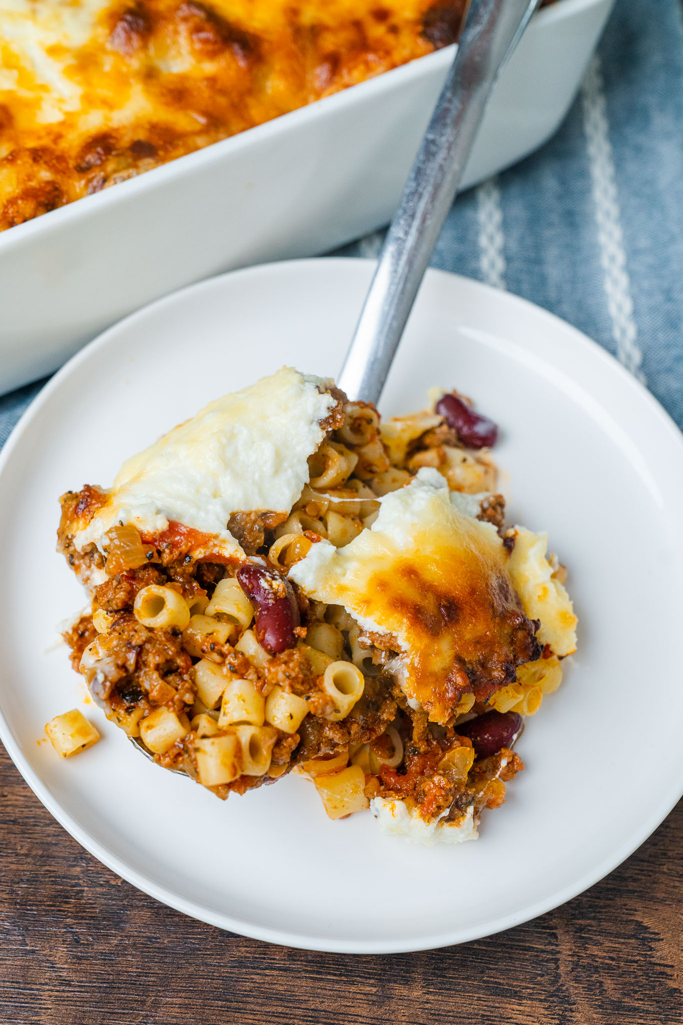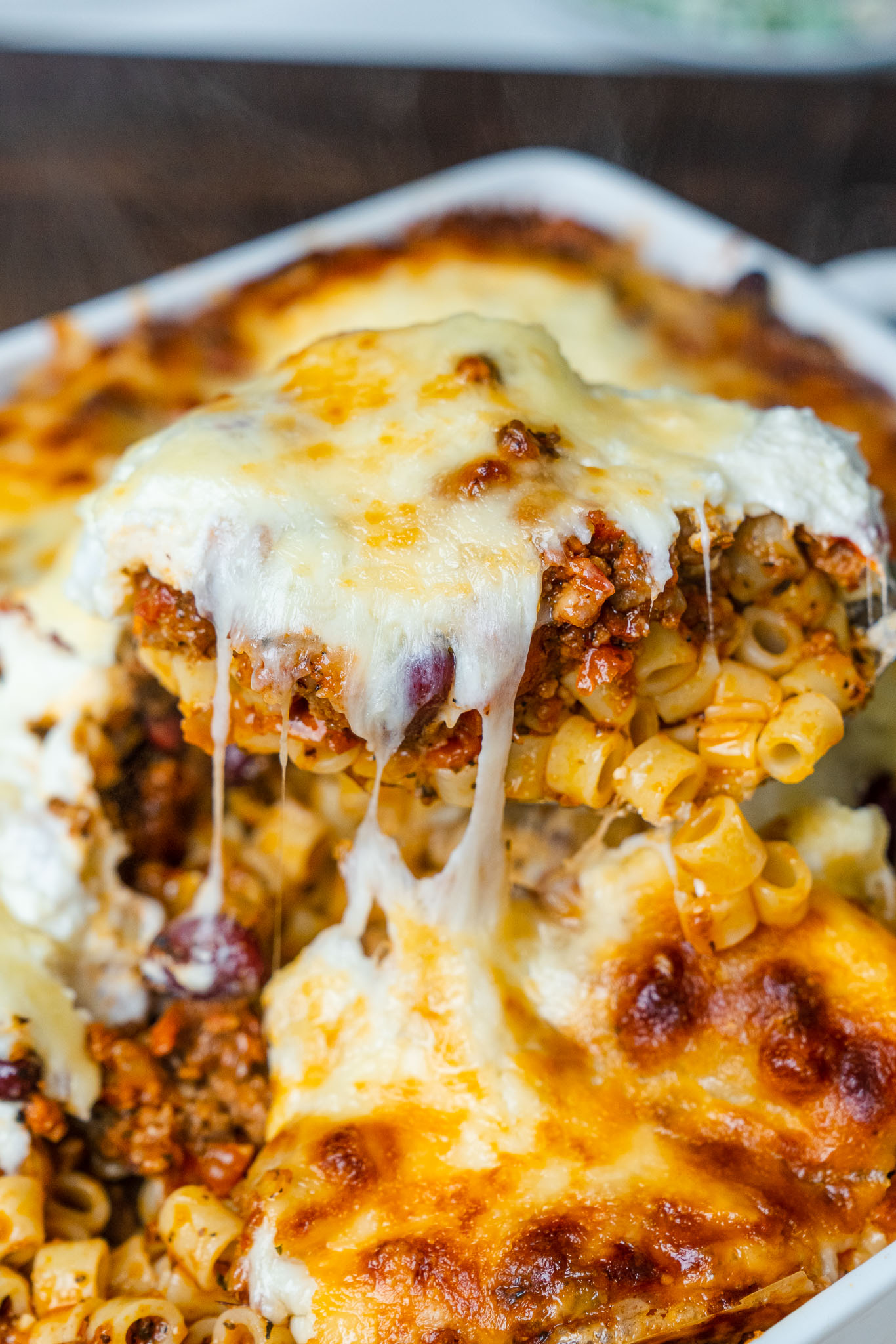 One of my favorite cold season soups has to be pasta e fagioli. It’s a bean and pasta soup with chunks of Italian sausage, tomato, and Ditalini pasta. This version takes everything amazing about this classic Italian soup and transforms it into a cheesy baked pasta.