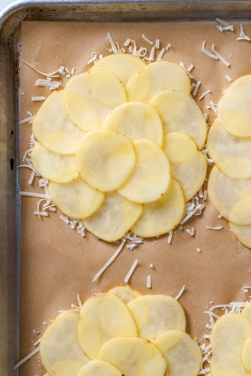 Preheat your oven to 400 degrees and prepare two sheet trays with parchment paper. Use a knife to trim off one end of each potato and then slice to about 1/16th inch thick using a mandolin. Using 1/8th cup of parmesan for each one, make four circles on each tray about five inches in diameter, then arrange the potato slices in a spiral pattern, overlapping the edges to cover. Drizzle or brush some oil over the surface, season lightly with salt and pepper, then cover with another sheet of parchment and bake for twenty minutes.