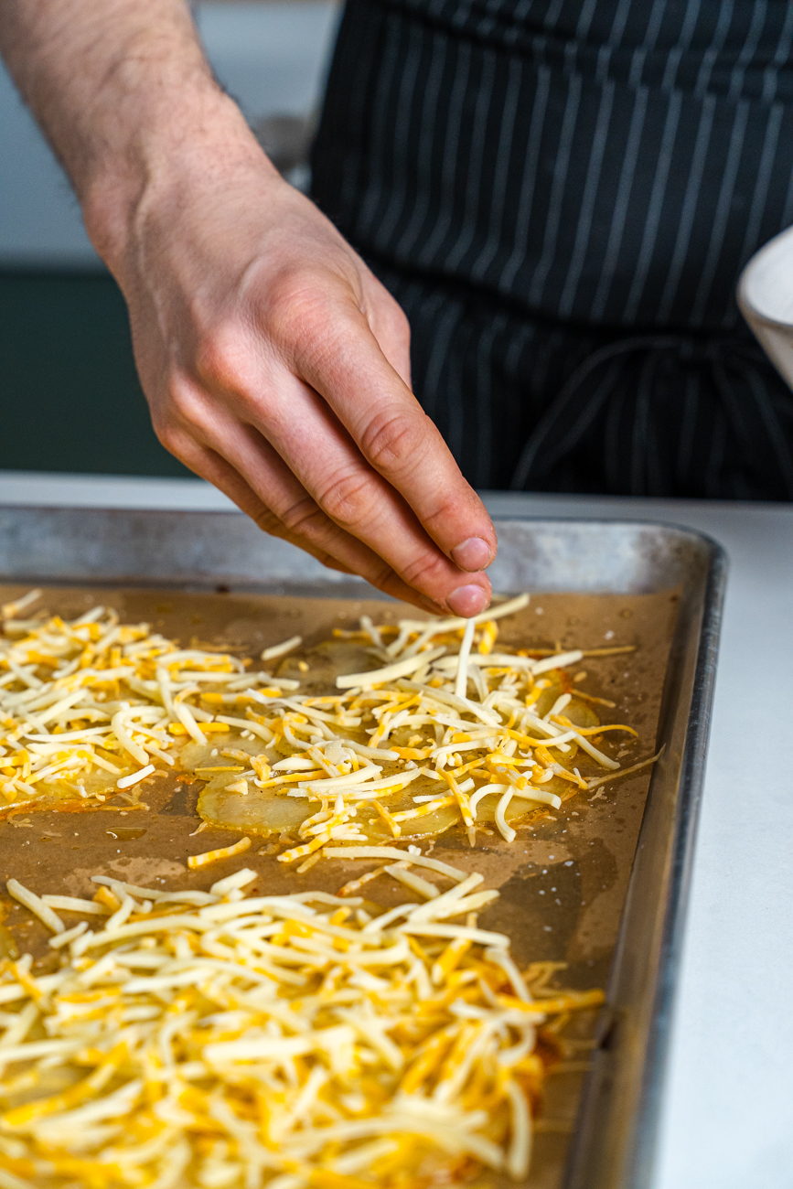 - Using 1/8th cup parmesan for each, make four circles on each tray about five inches in diameter, then arrange the potatoes in a spiral pattern on top of each one, making sure the edges of the potato overlap slightly.