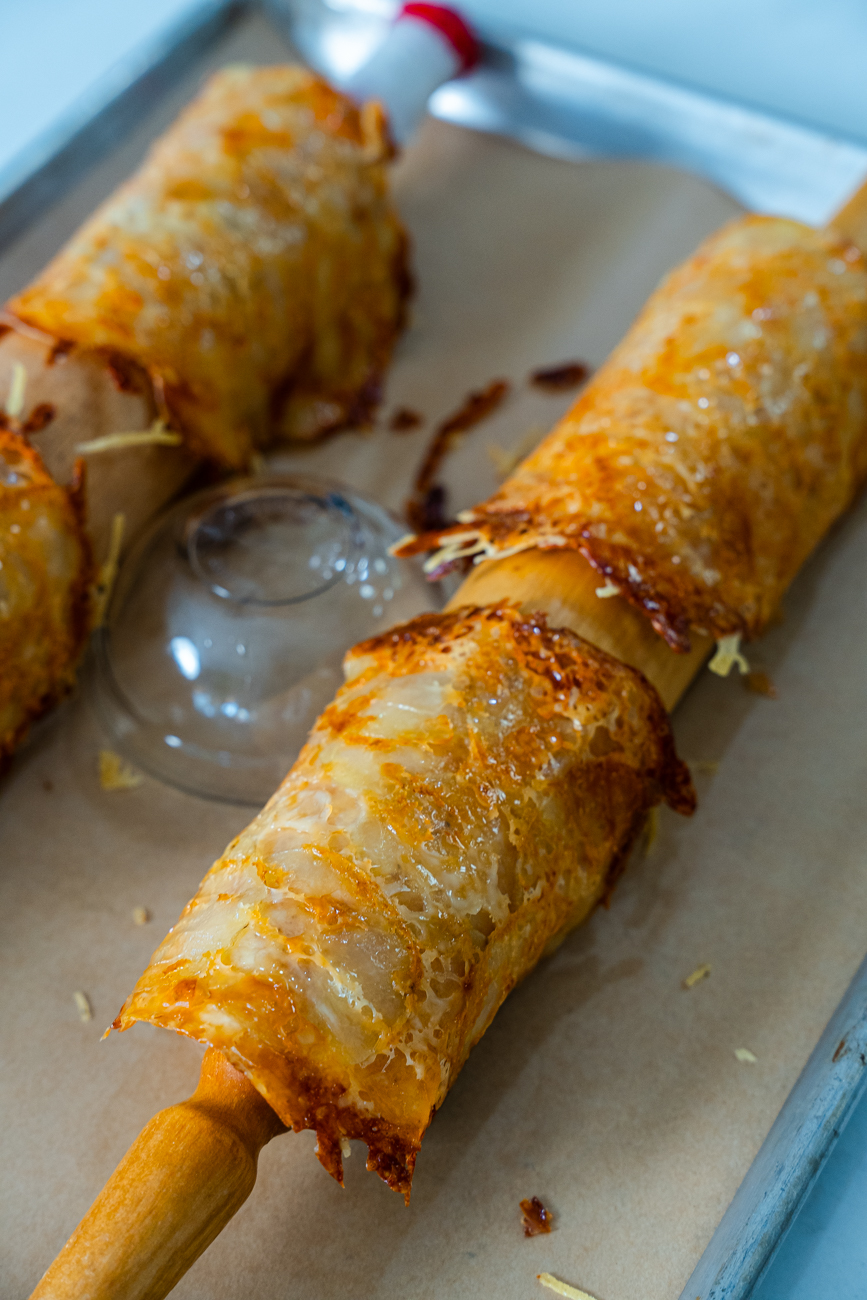 Remove them from the oven and allow to rest briefly for one minute. Each shell then needs to be molded into a taco shape. I like using a rolling pin here, but you can get creative and use things like empty water or wine bottles, flower vases, I’ve even used my oven doorhandle in a pinch. Allow them to cool completely before removing from the mold and thats it!