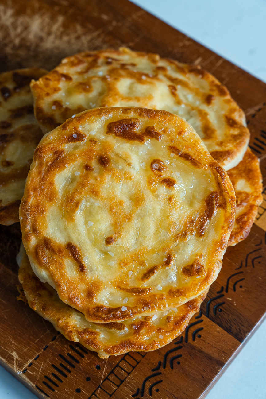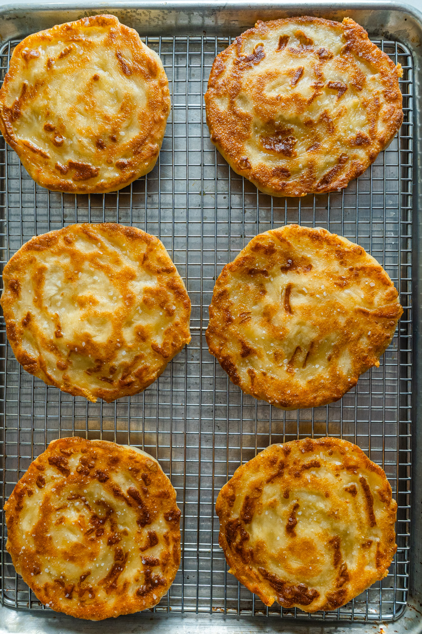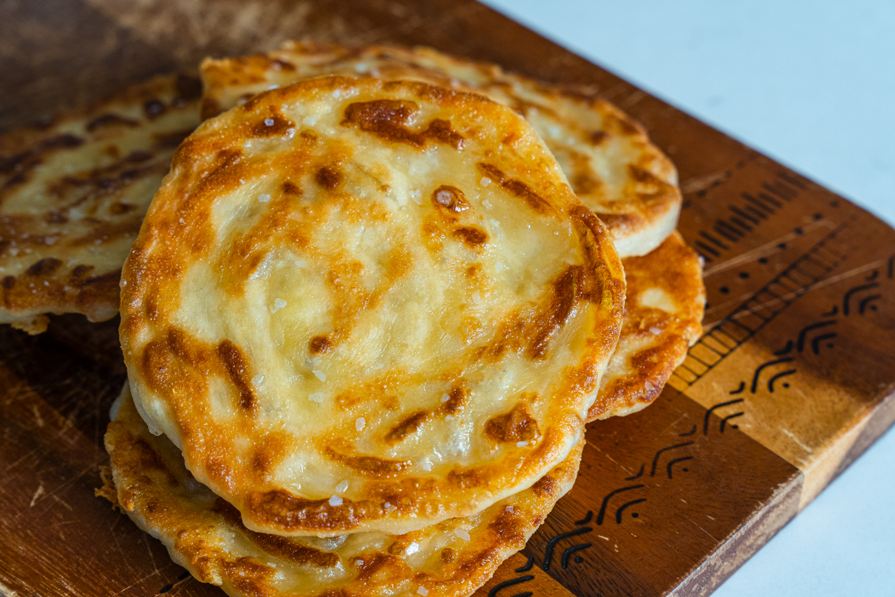 The flatbread is ready for the skillet, where the heat will transform the pale disk into a golden circle of toasty, cheesy bread. Nothing ever goes wrong when butter is added to something cheesy, so the last step is to brush melted butter over both sides and sprinkle coarse salt over the top.