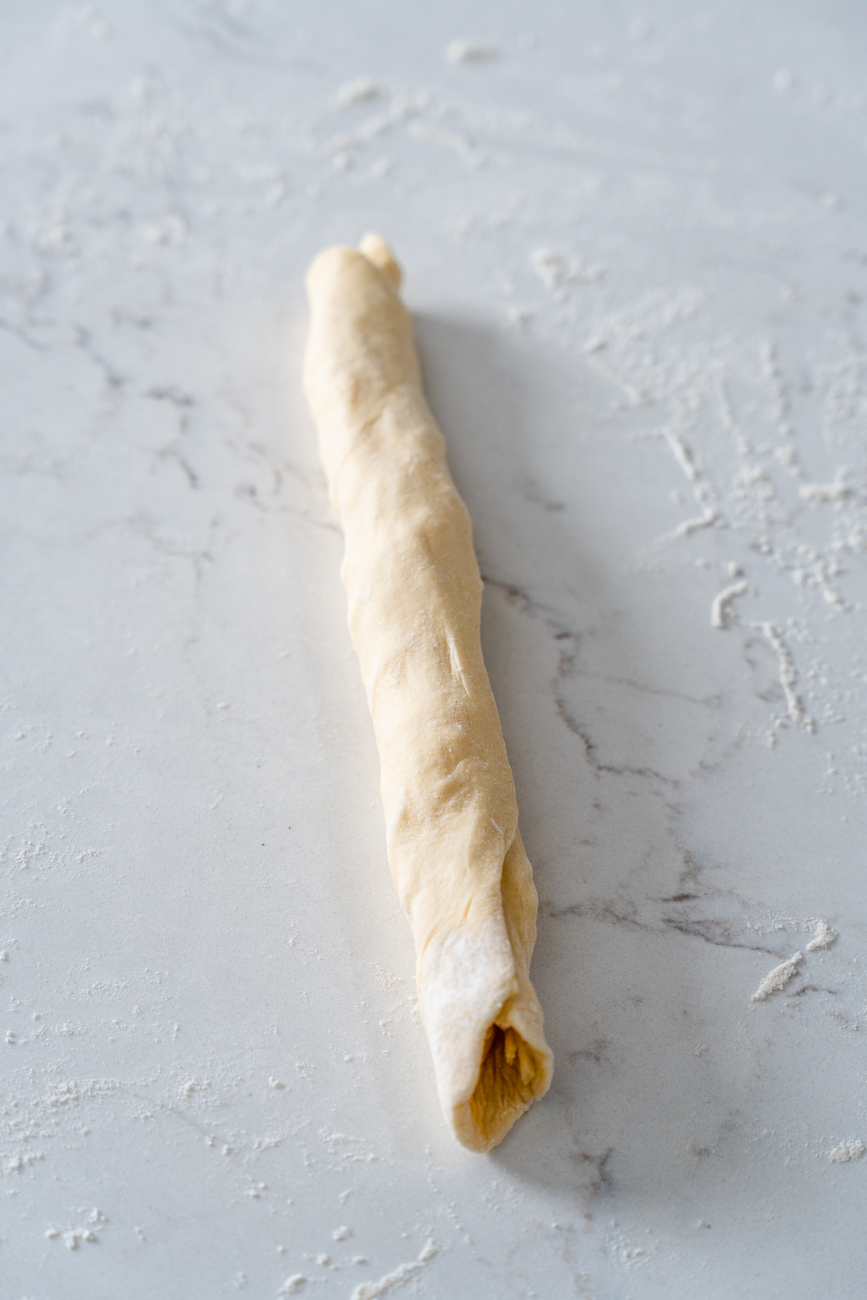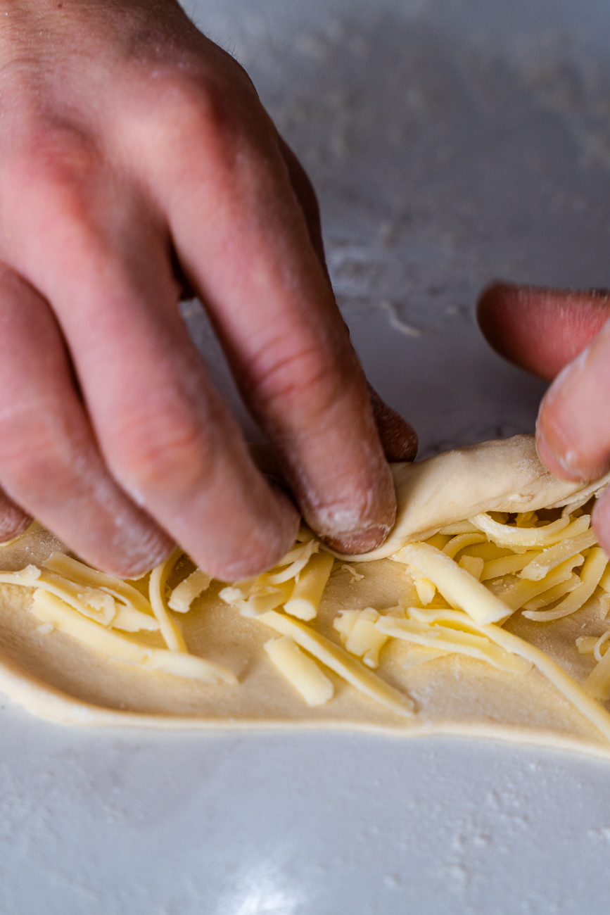 Once the dough has risen and divided into equal parts, it’s ready for the cheese and a little more manipulation to turn the dough balls into oblong pieces. Cheese is rolled into the bread to achieve a tube shape. That tube is pulled and rolled into a spiral, then flattened and shaped with a rolling pin into a flat disk, about 4-5” in diameter.