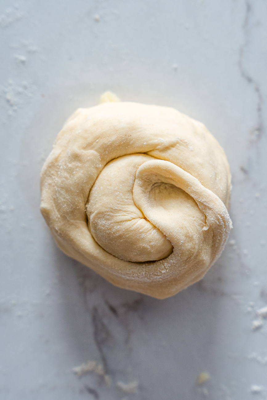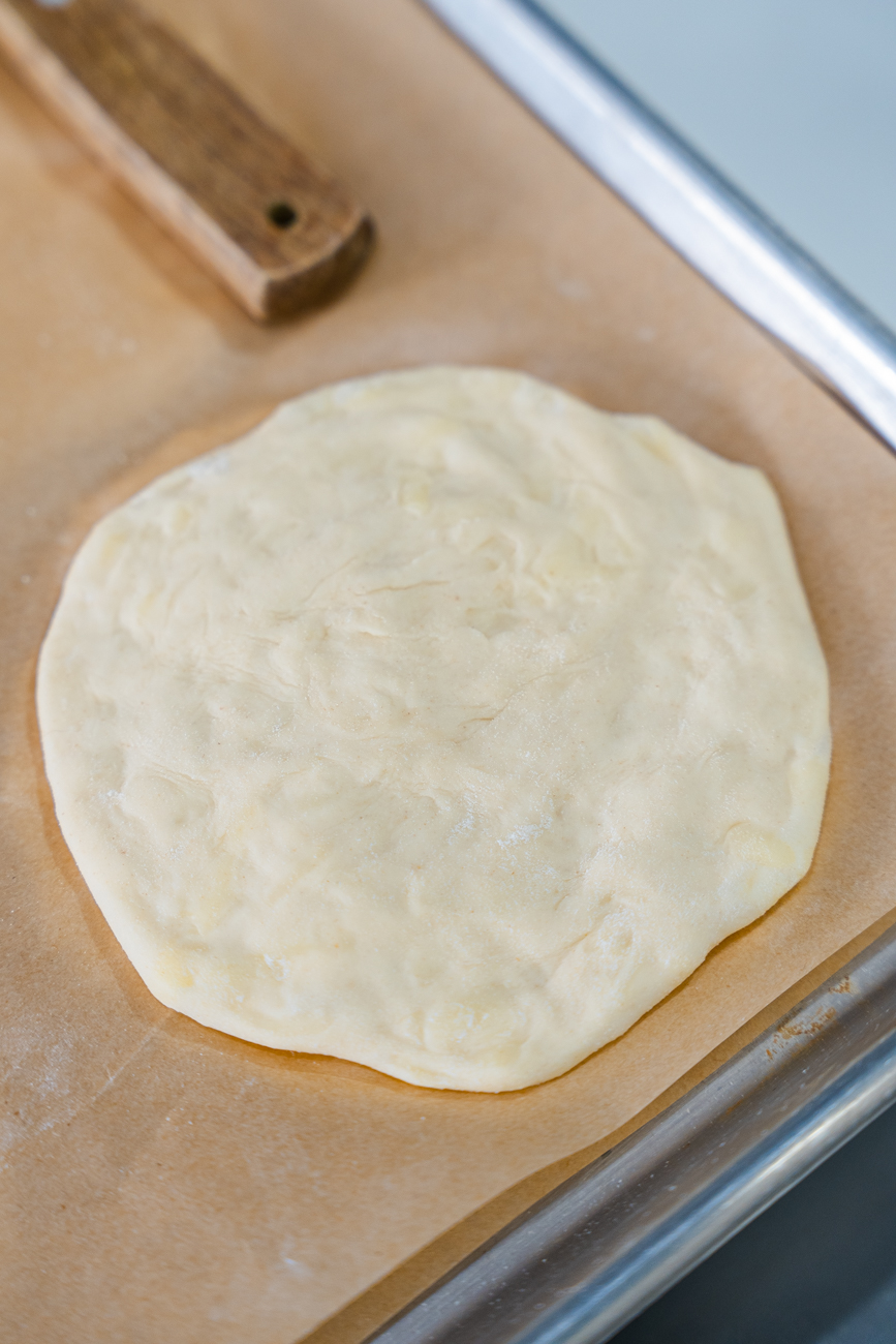 - Shape this rope of dough into a tight coil, pressing the end into the top of the disc. Roll this disk out to a flat circle about 4-5” in diameter, then set aside to rest between layers of parchment for 20 minutes.