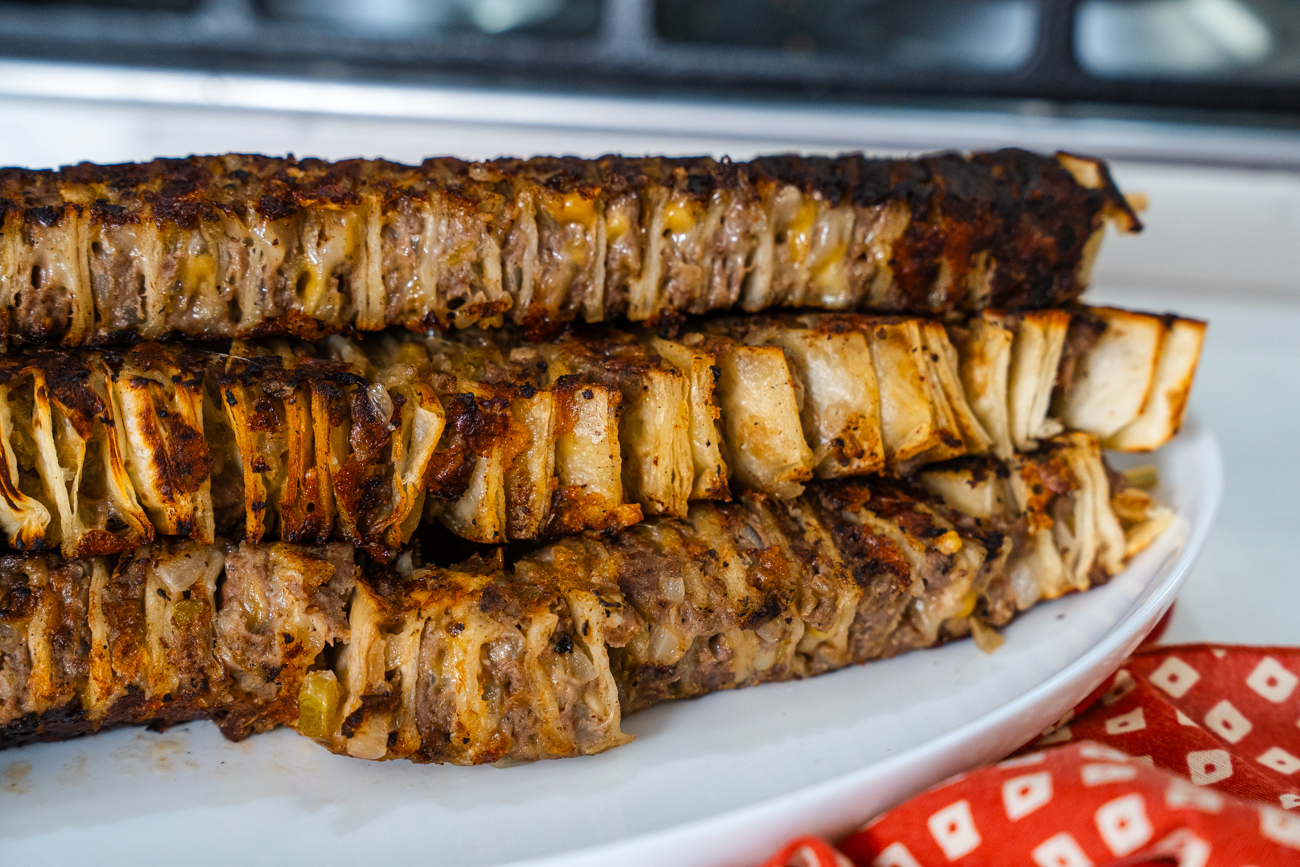 When making anything with layers, there will be a process; this recipe is no different. It starts with burrito-sized tortillas cut into squares. Next, the filling: ground beef, garlic, green chilis and spices are mixed together, much like you’d do when making taco filling.