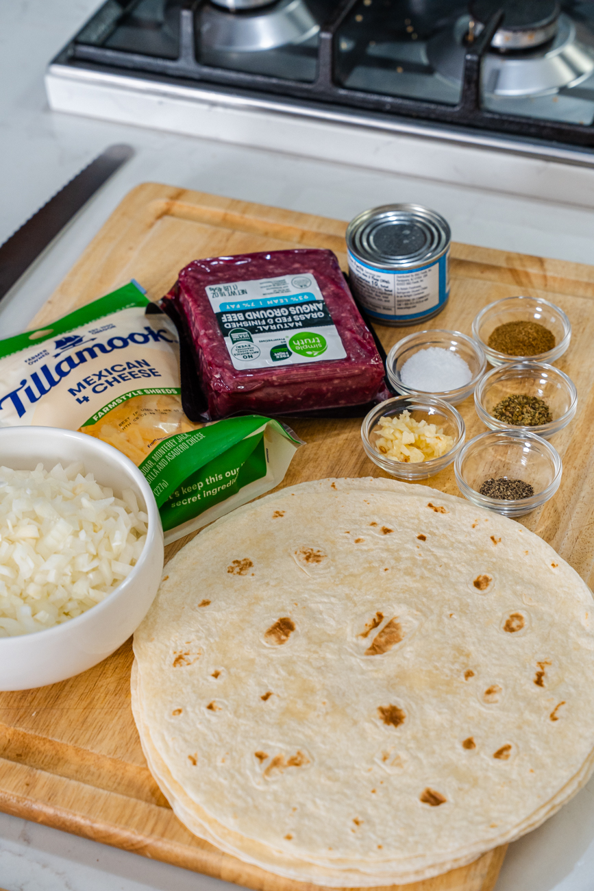 - Meanwhile, in a mixing bowl, combine the beef, cheese, chilis (if using), salt, cumin, oregano, and black pepper. Add the cooled onion and garlic mixture and mix thoroughly. Set aside while you prepare the tortillas.