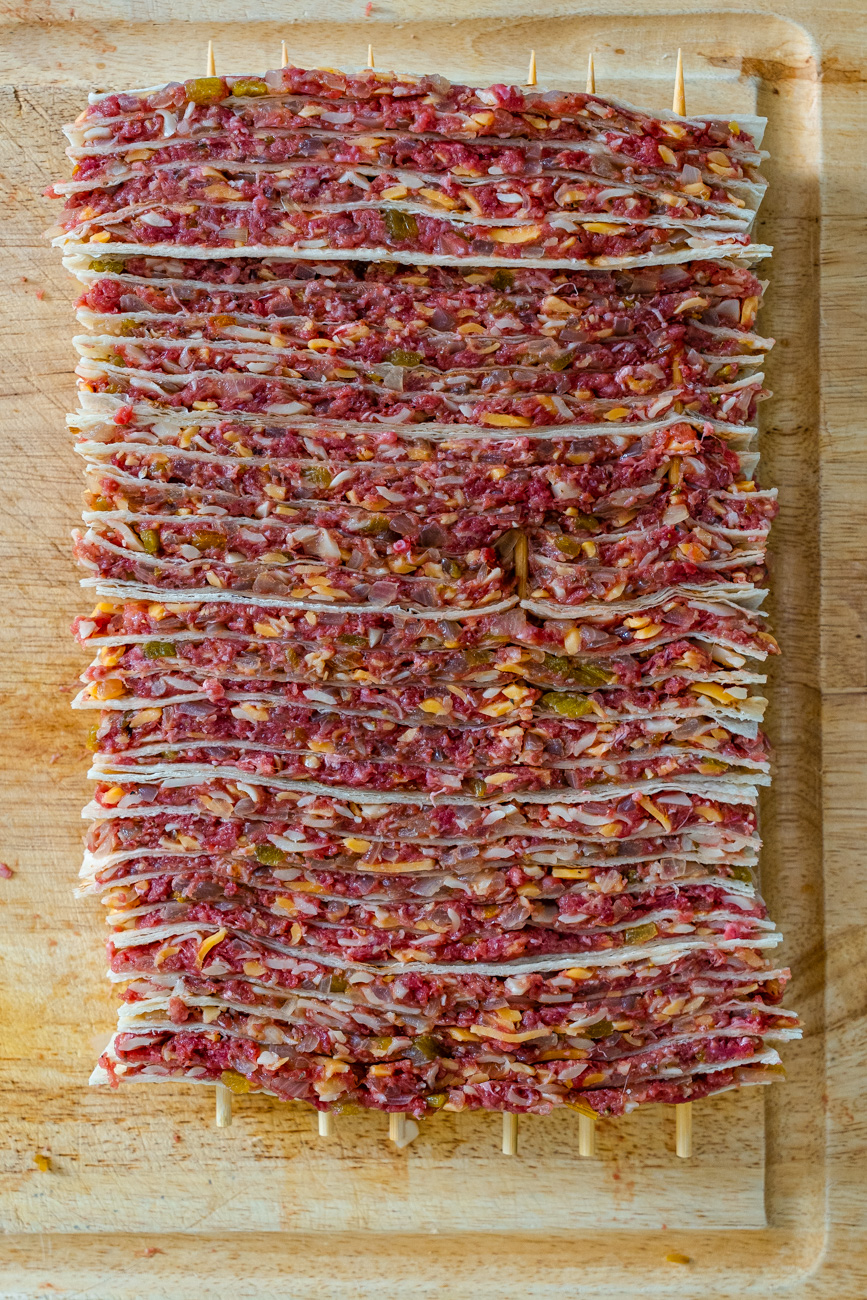 The seasoned meat is then spread in a layer over each tortilla and stacked to create multiple layers, beginning and ending with a layer of tortilla.