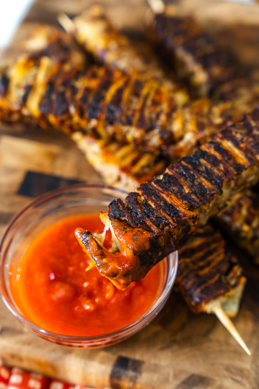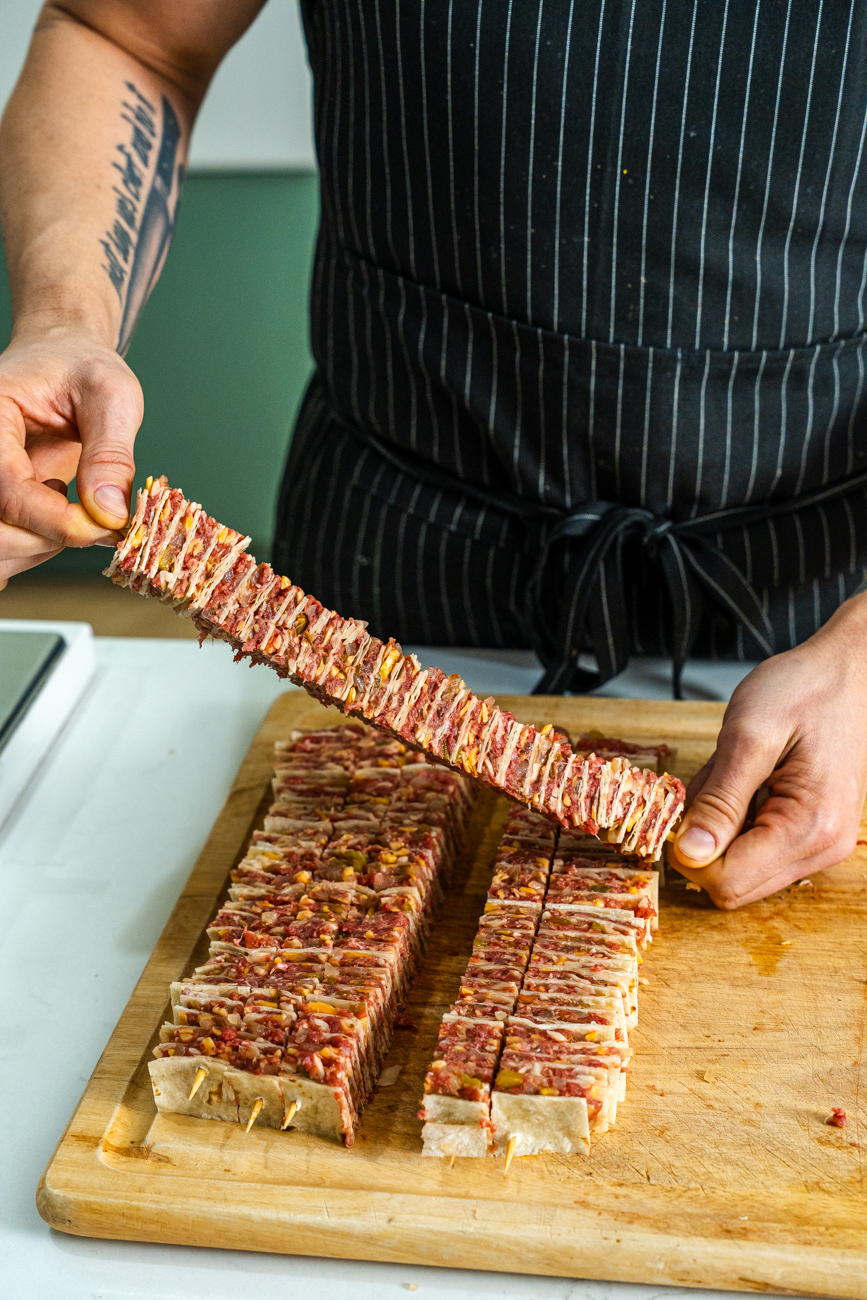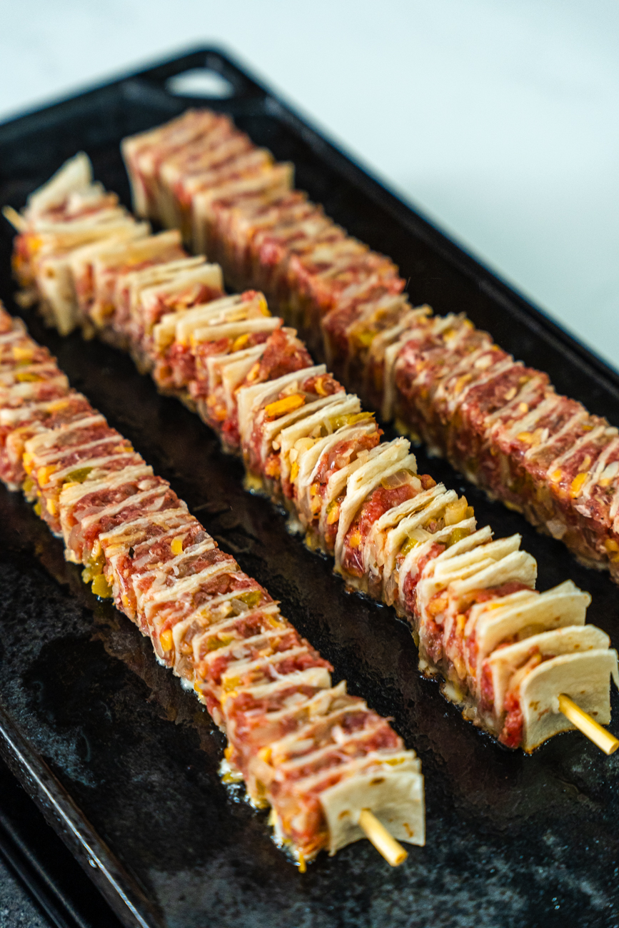 I line up the stacks, run skewers through to connect the layers, and then carefully slice to create these skewer-length sections. I recommend using a bread knife to cut these stacks!