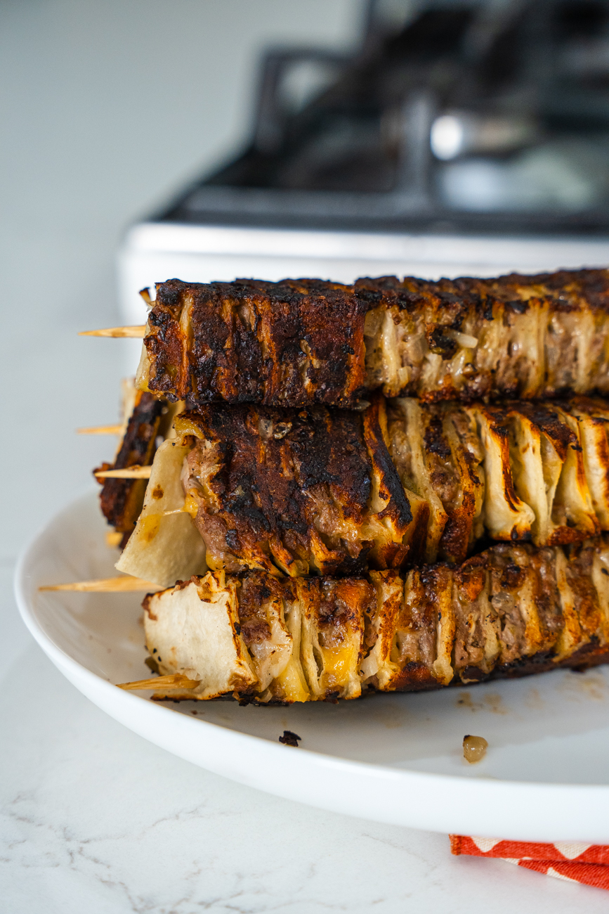 A hot grill or griddle is the next step, about three minutes per side to cook the meat and toast up the edges of the tortillas.