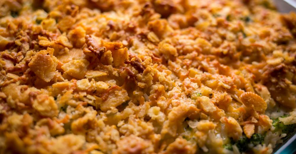 - Combine crushed crackers, butter, and remaining shredded cheddar cheese. Sprinkle topping over top of the casserole.