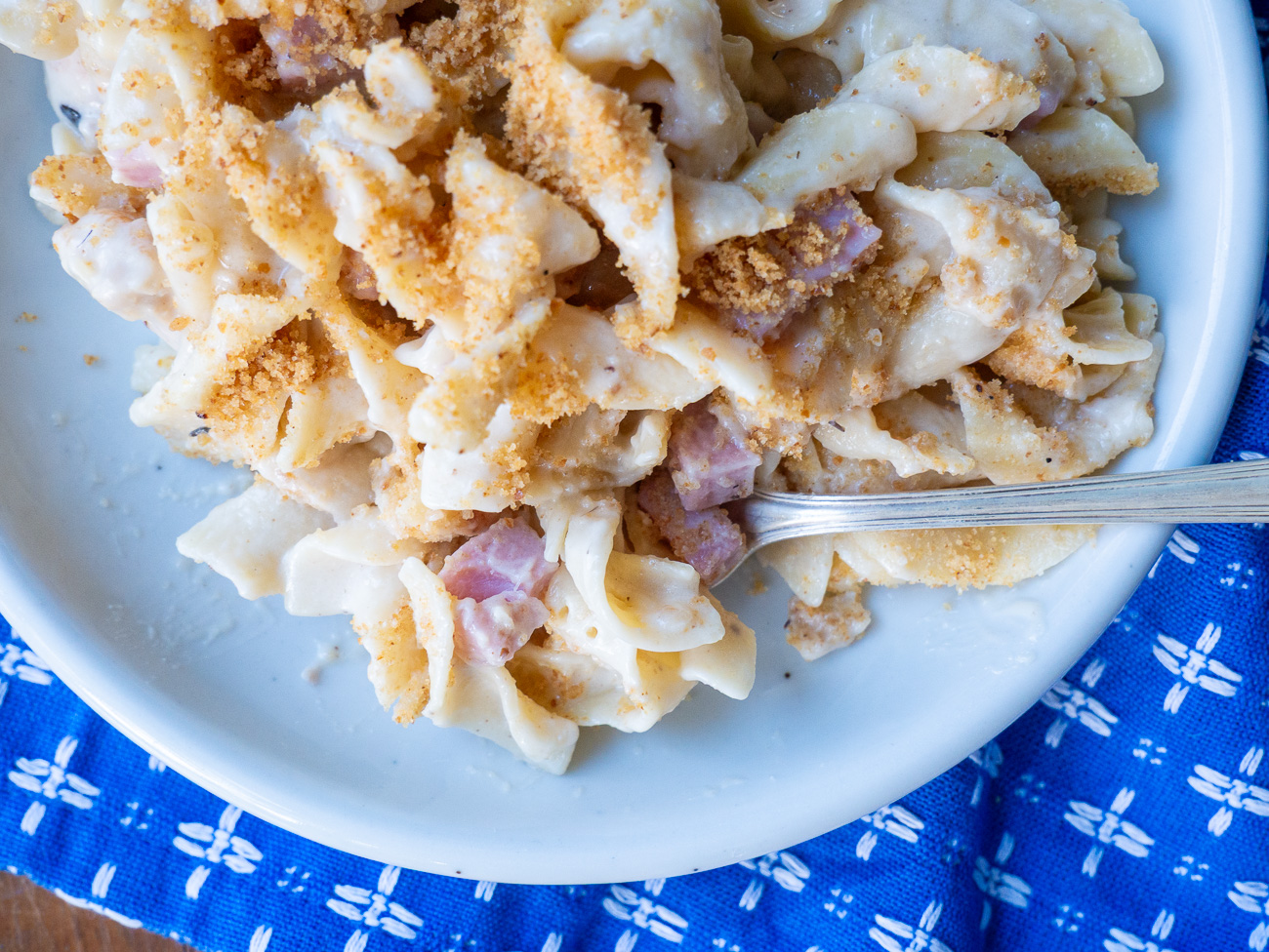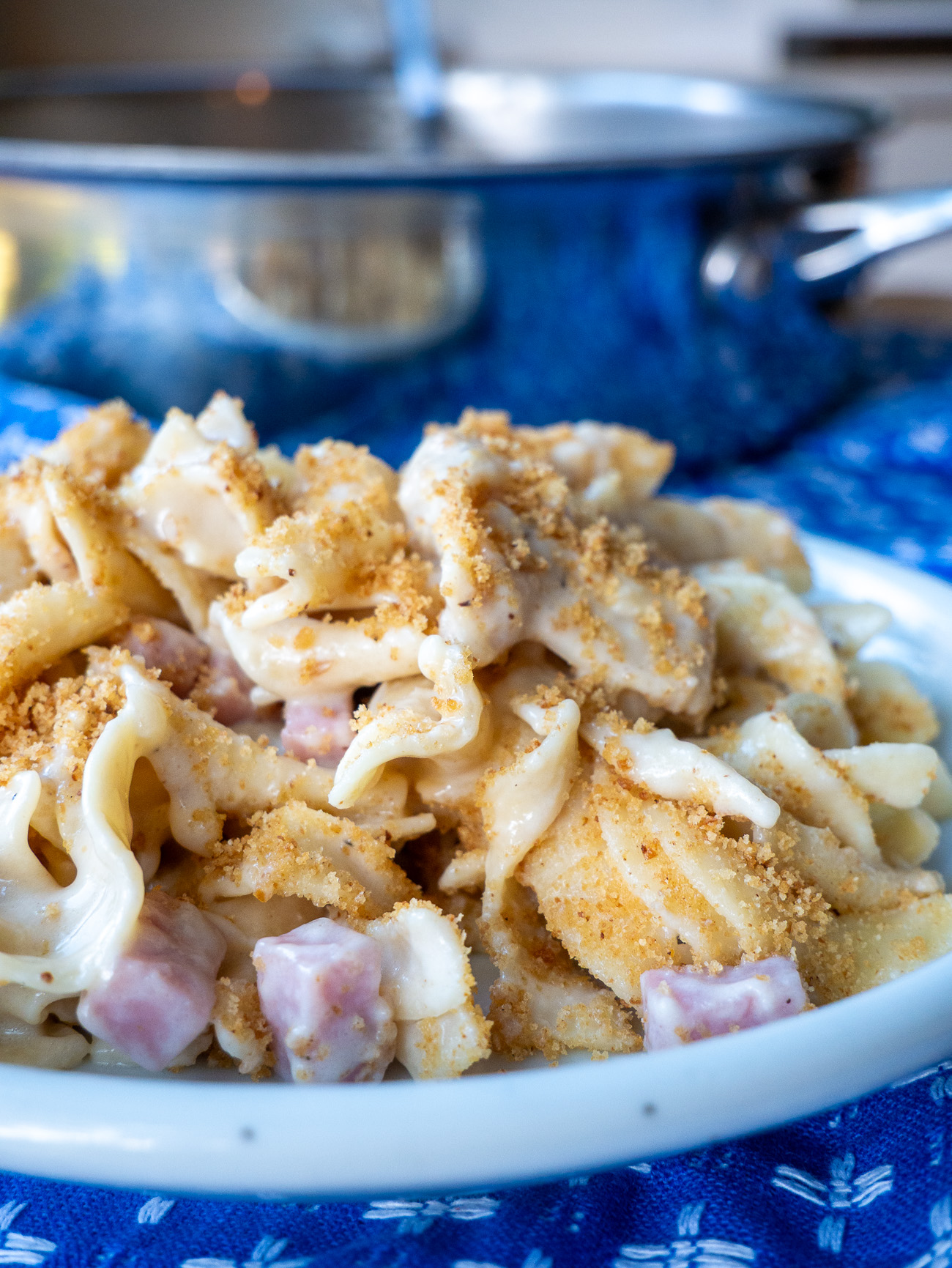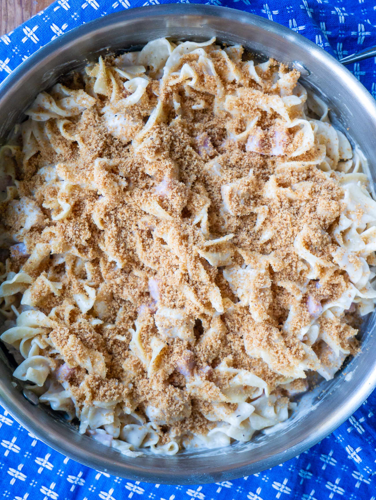 At this point, the noodles should be tender and the liquid should have absorbed quite a bit. If not, let it simmer a little longer. Off the heat, stir in the cheese until it melts and then season it with salt and pepper. Go ahead and cover it and let it sit there while you work on the breadcrumbs. (The sauce will also thicken up a bit here, which is fine. If you need to thin it out you can stir in a bit more half and half or cream.)