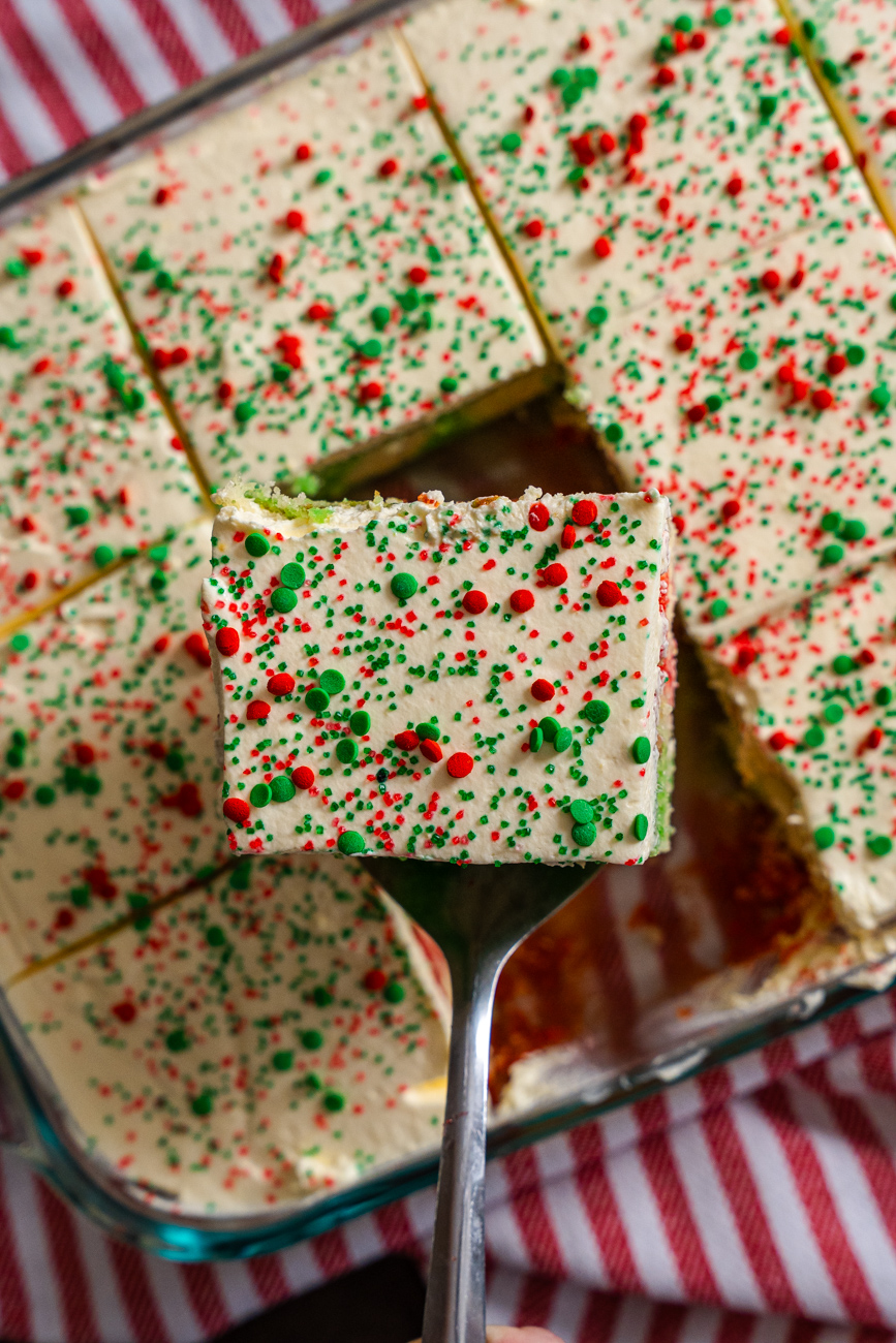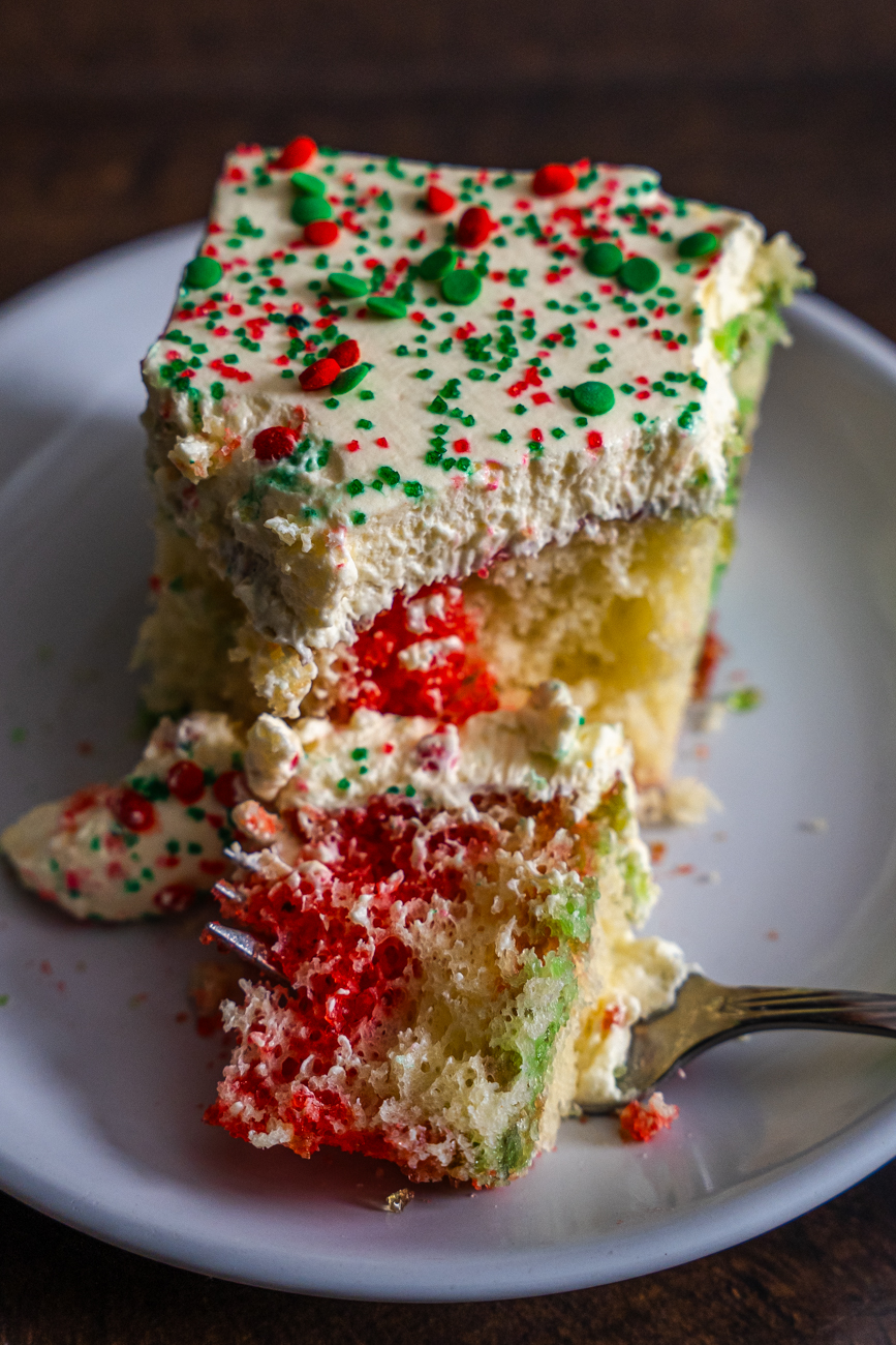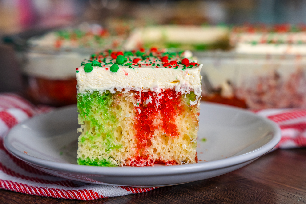 It’s the time of year for festive baking! But baking doesn’t have to be hard. To the contrary, this Christmas Poke Cake starts with a boxed mix and uses a few other shortcut ingredients for a cake with festive flavor that runs the whole way through. It’s the perfect (simple!) way to celebrate the season.