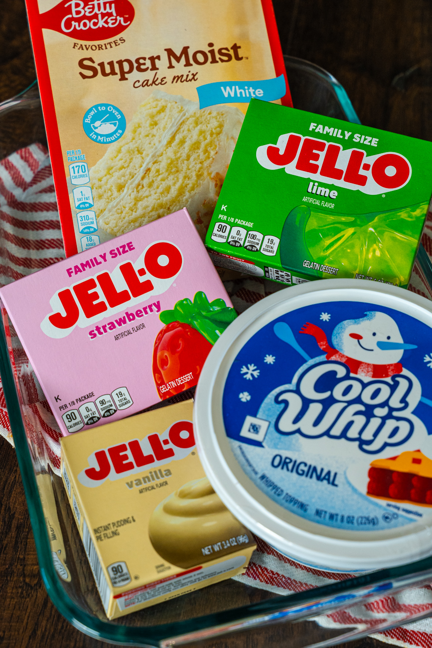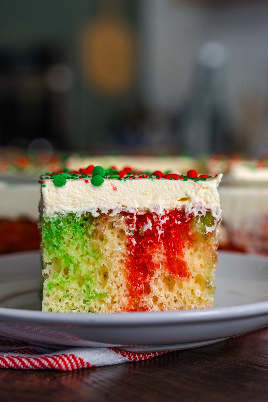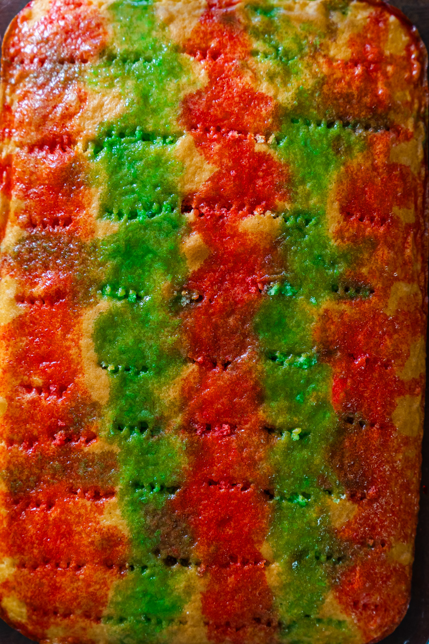 - Pour green and red jello in alternating rows over the cake, making sure you use enough that it sinks down into the holes. (You likely will not use ALL of the jello.)