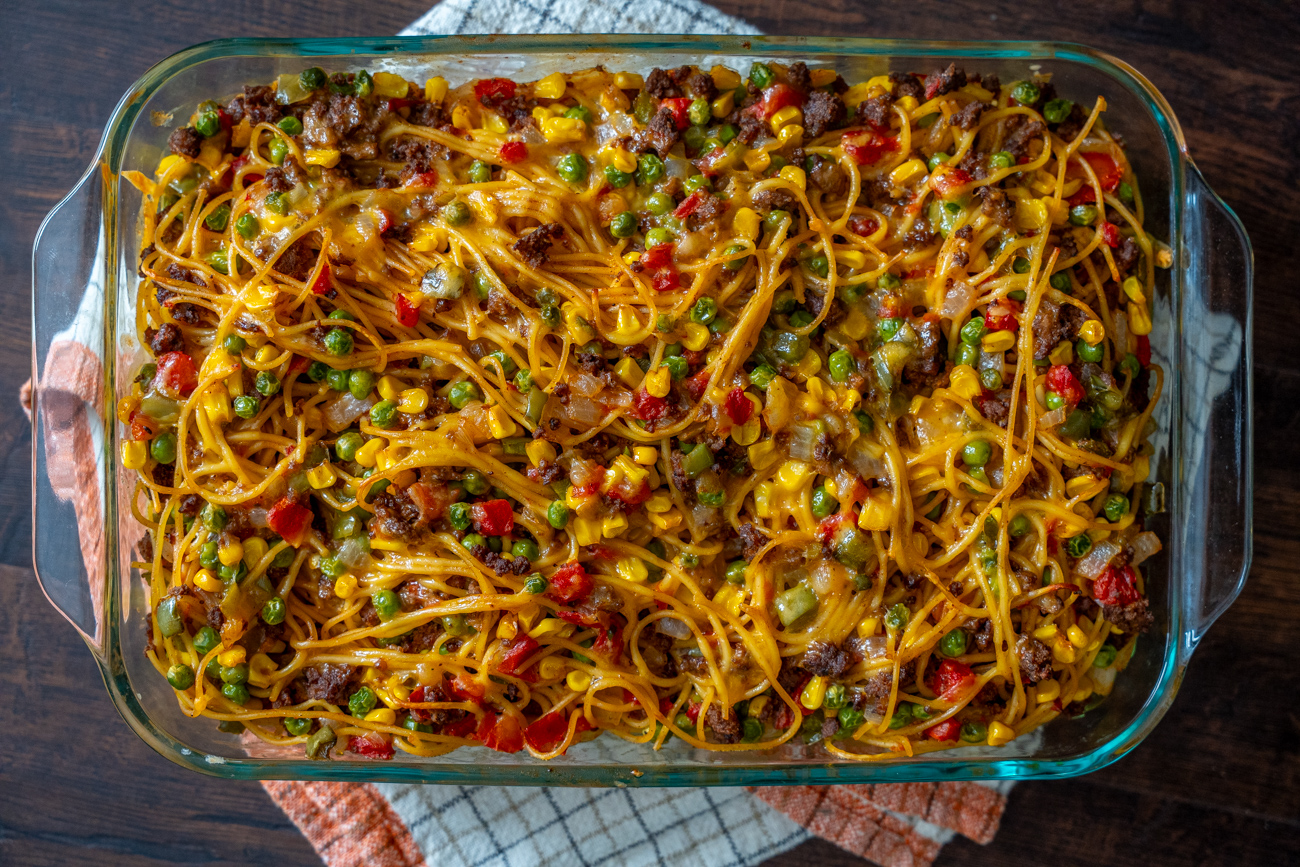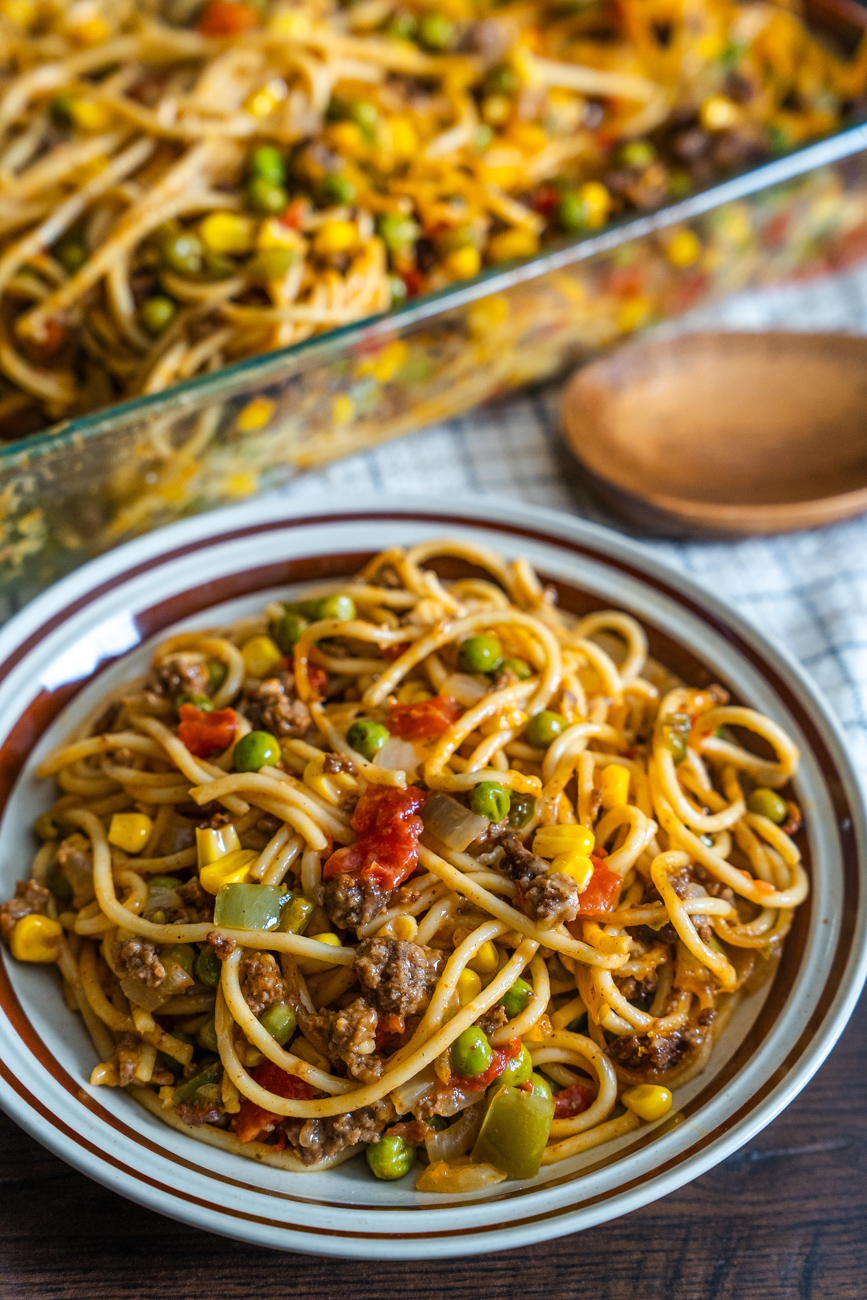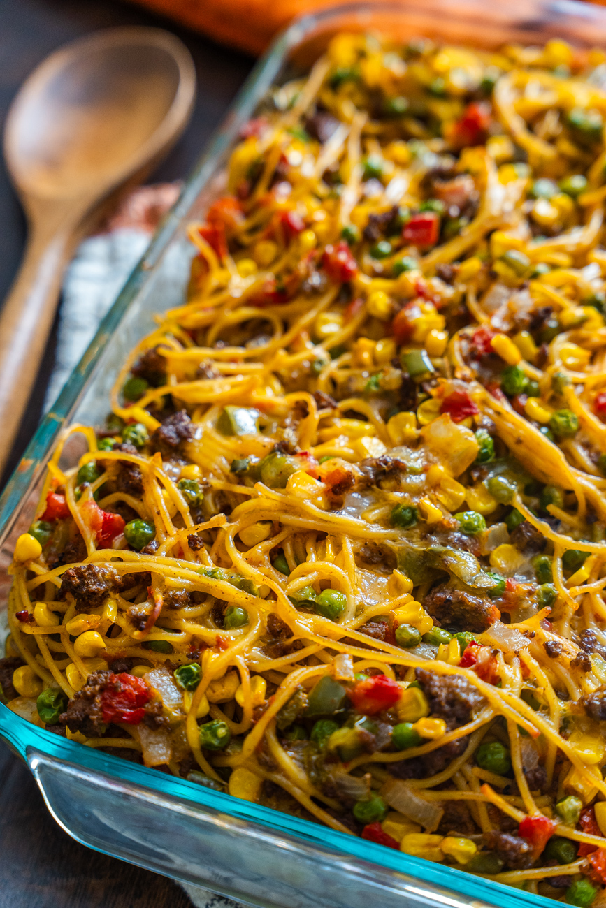 As you can probably tell from the photos, Church Supper Spaghetti is definitely not your traditional Italian spaghetti. While there are some tomatoes in it, the sauce is far from marinara, but there are some other fun additions like bell pepper, peas, corn, and cheddar cheese. It’s a lot in one 9×13 dish, but that’s what truly good casseroles know how to do. And this one is just the kind of comforting crowd-pleaser that people are always happy to see at potlucks, church suppers, and family gatherings alike. It’s easy to make and even easier to enjoy!
