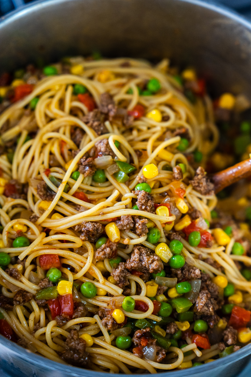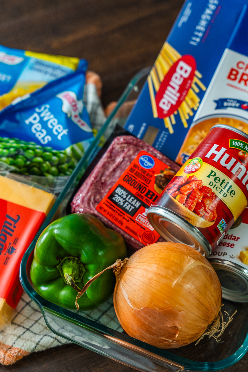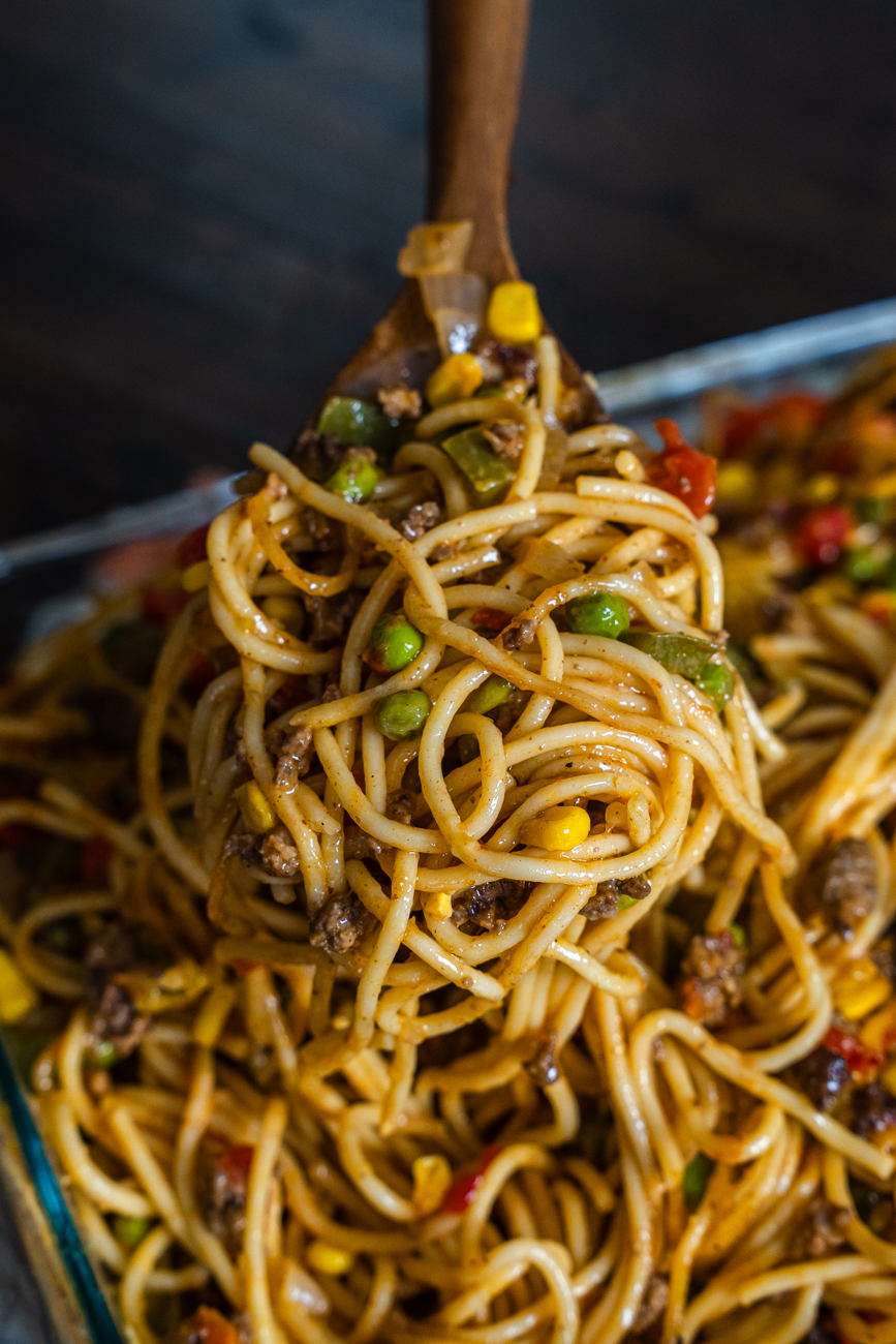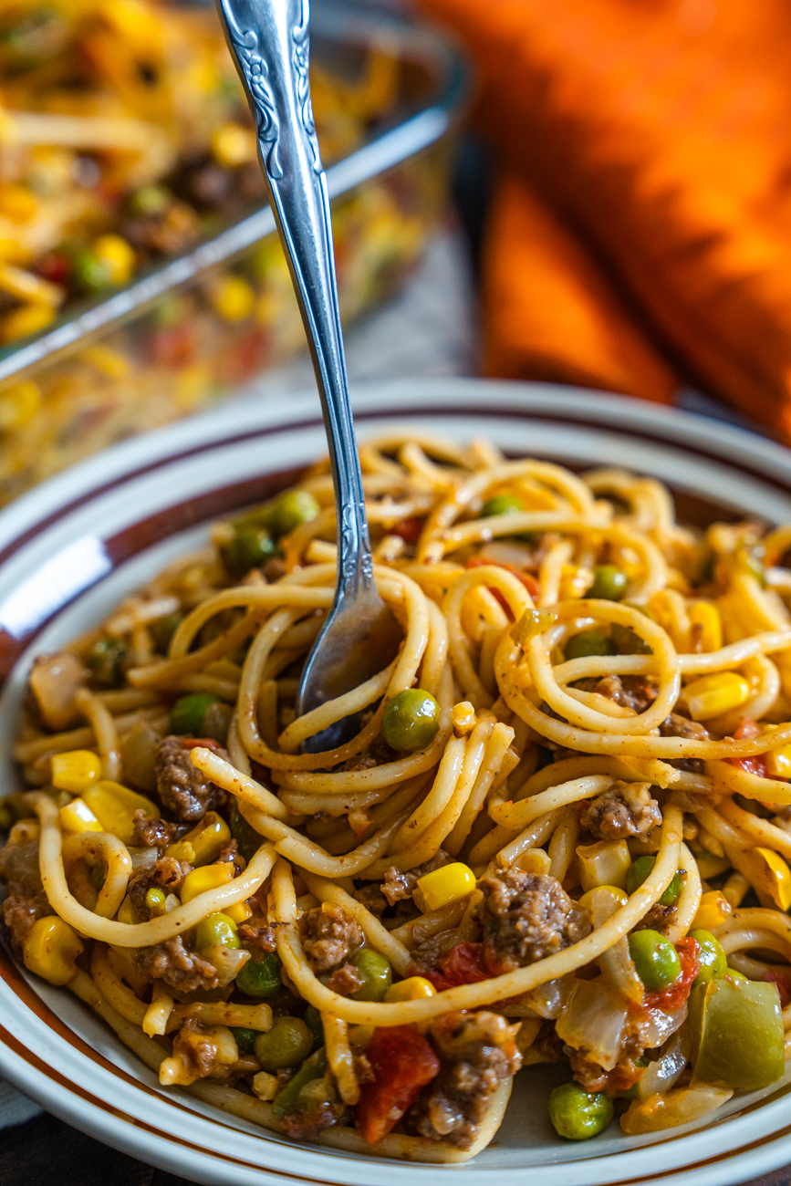 As you can probably tell from the photos, Church Supper Spaghetti is definitely not your traditional Italian spaghetti. While there are some tomatoes in it, the sauce is far from marinara, but there are some other fun additions like bell pepper, peas, corn, and cheddar cheese. It’s a lot in one 9×13 dish, but that’s what truly good casseroles know how to do. And this one is just the kind of comforting crowd-pleaser that people are always happy to see at potlucks, church suppers, and family gatherings alike. It’s easy to make and even easier to enjoy!
