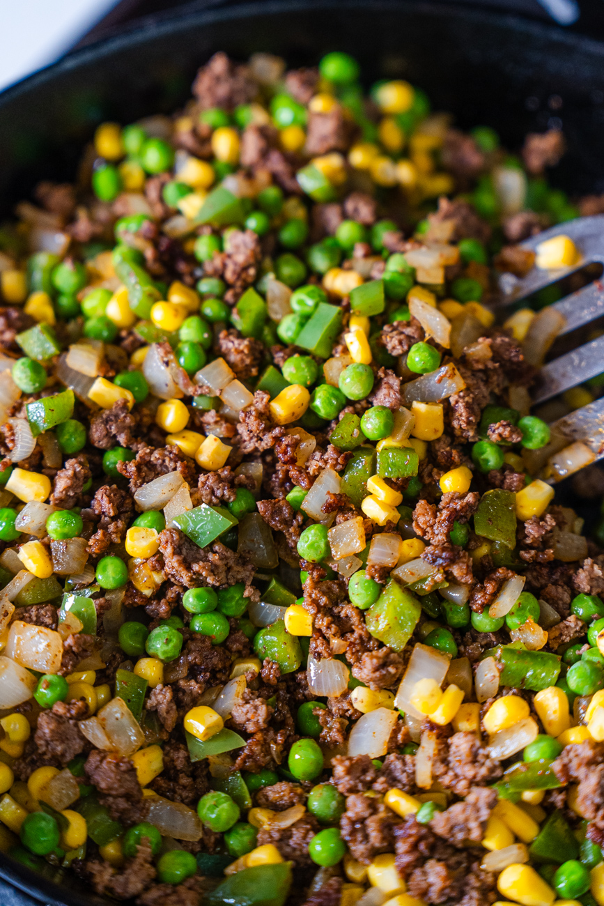 - Add peas, corn, diced tomatoes, and broth, and stir until mixed. Cook, stirring occasionally until heated through and liquid reduces a bit, about 5 minutes.