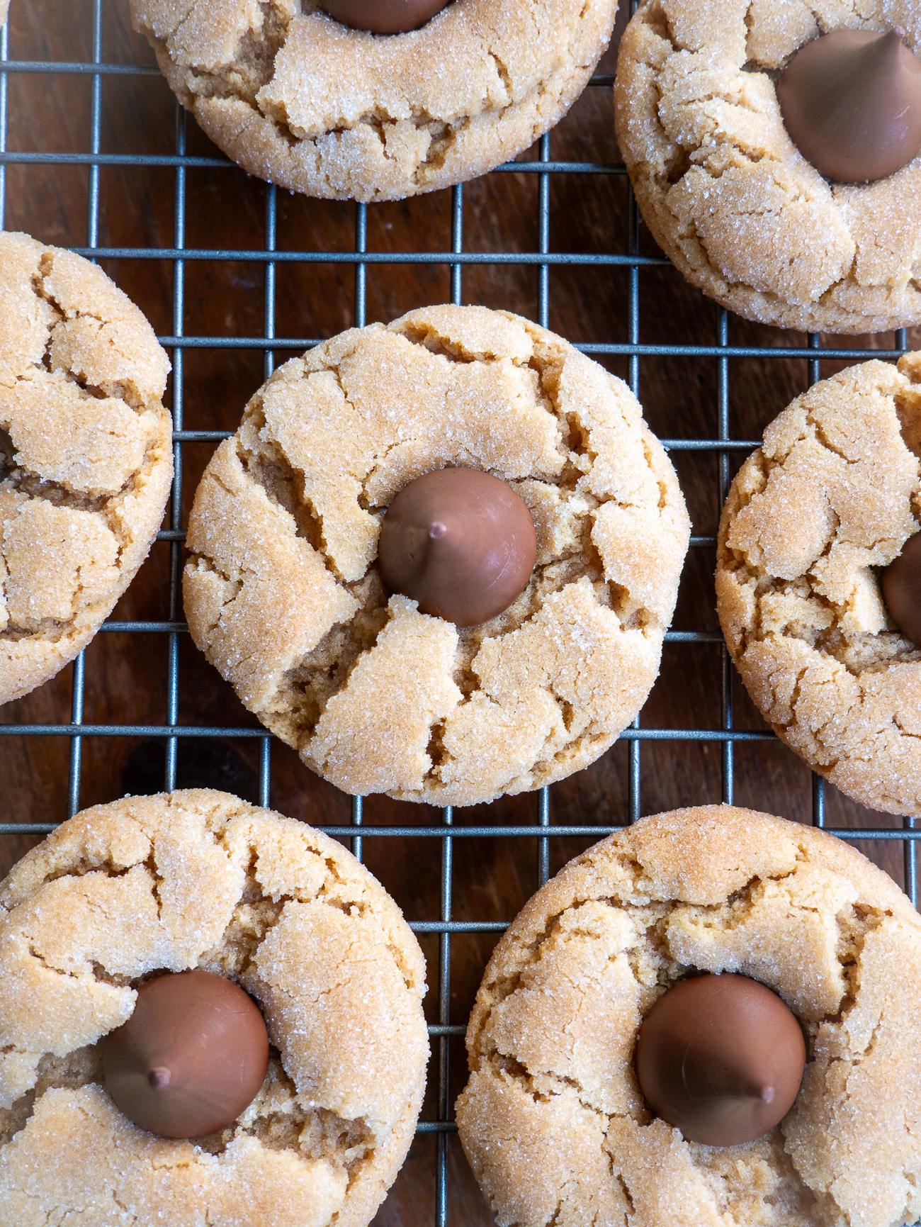 Once they’re out of the oven, press a candy kiss into the center of each cookie and transfer them to a wire rack to cool. You want to let them cool completely before you serve them — the chocolate will soften quite a bit from the residual heat but then set up again. They’ll still be soft enough to easily bite into, so don’t worry there.