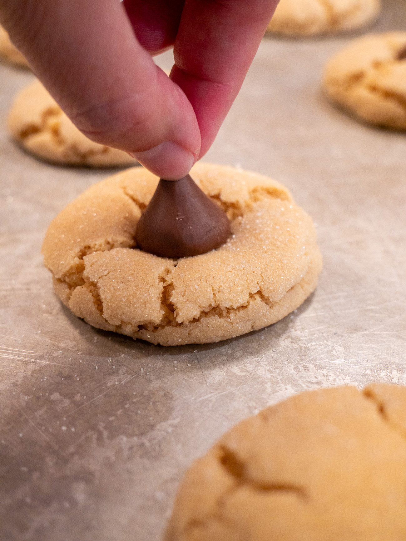 - Baking just one cookie sheet at a time, bake until edges turn a light golden brown, 8-10 minutes, then remove from oven and immediately press 1 chocolate candy kiss in the center of each cookie. Remove cookies to a wire rack to cool.