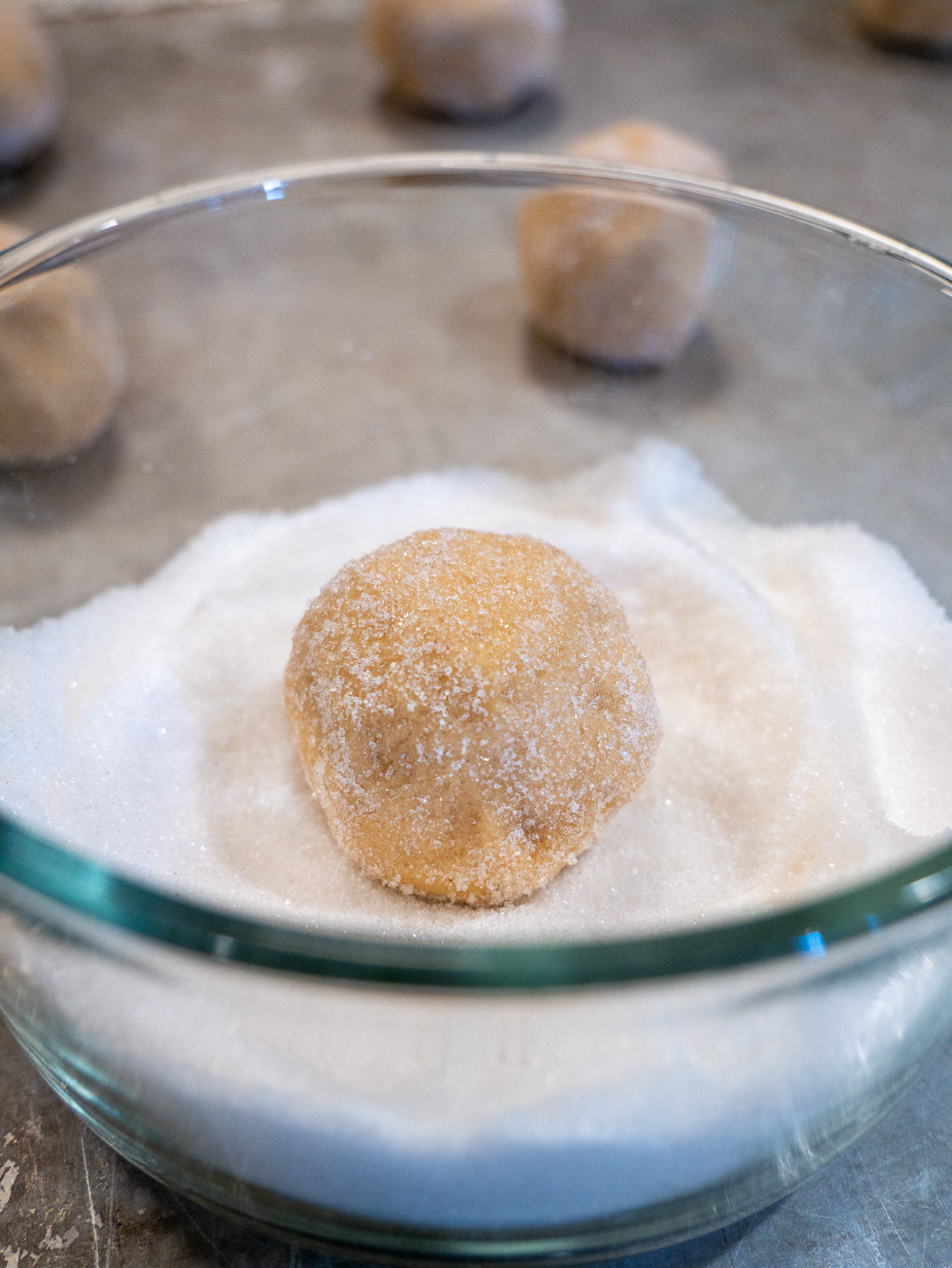 That’s the dough! From there, you simply scoop out the dough and shape it into a ball that’s about an inch wide and roll it in granulated sugar.