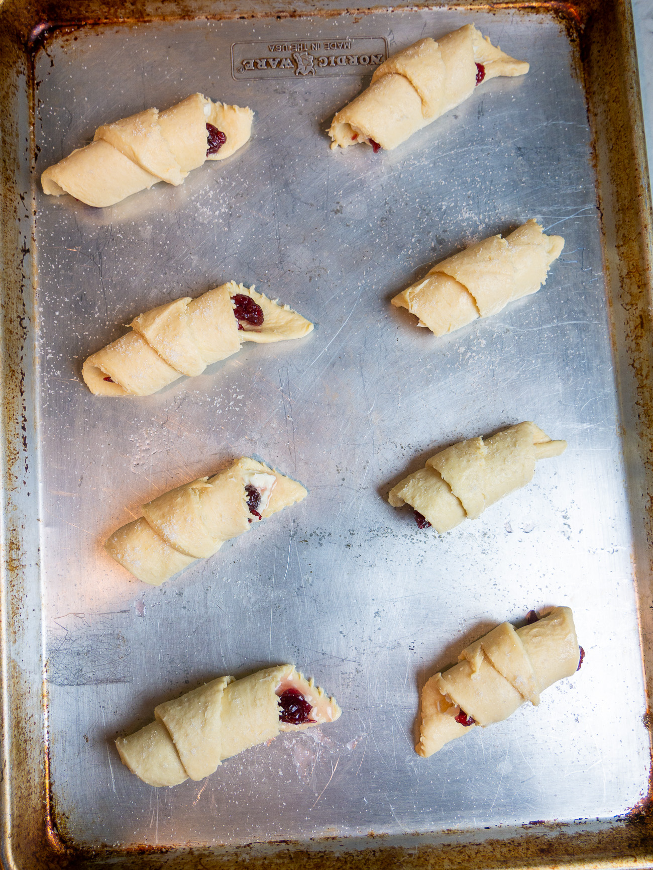 - Top with a line of cranberry sauce. Roll dough forward, starting with the end closest to you, into a spiral.