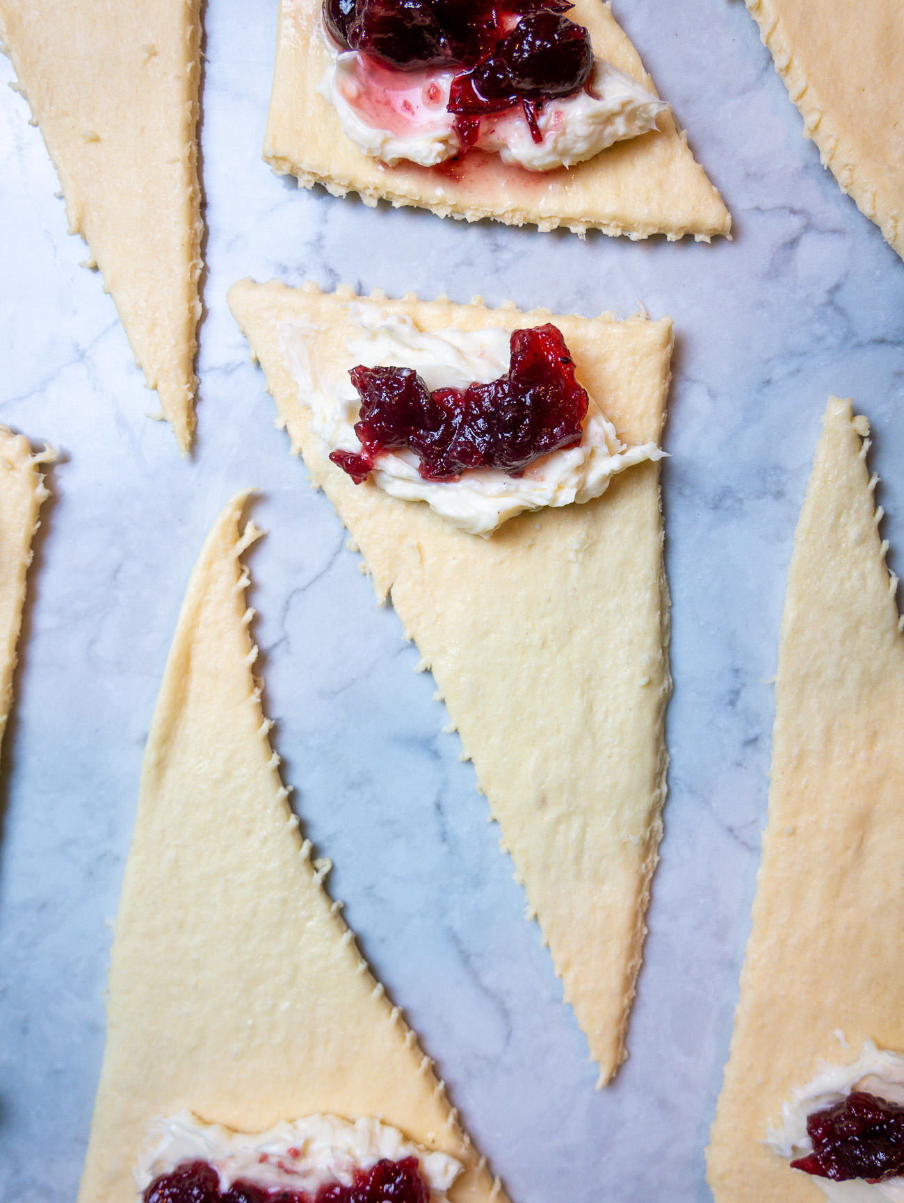 Take about a tablespoon of that cream cheese mixture and spread it on the widest end of the crescent dough triangle. Then, dollop that with a bit of the cranberry sauce.
