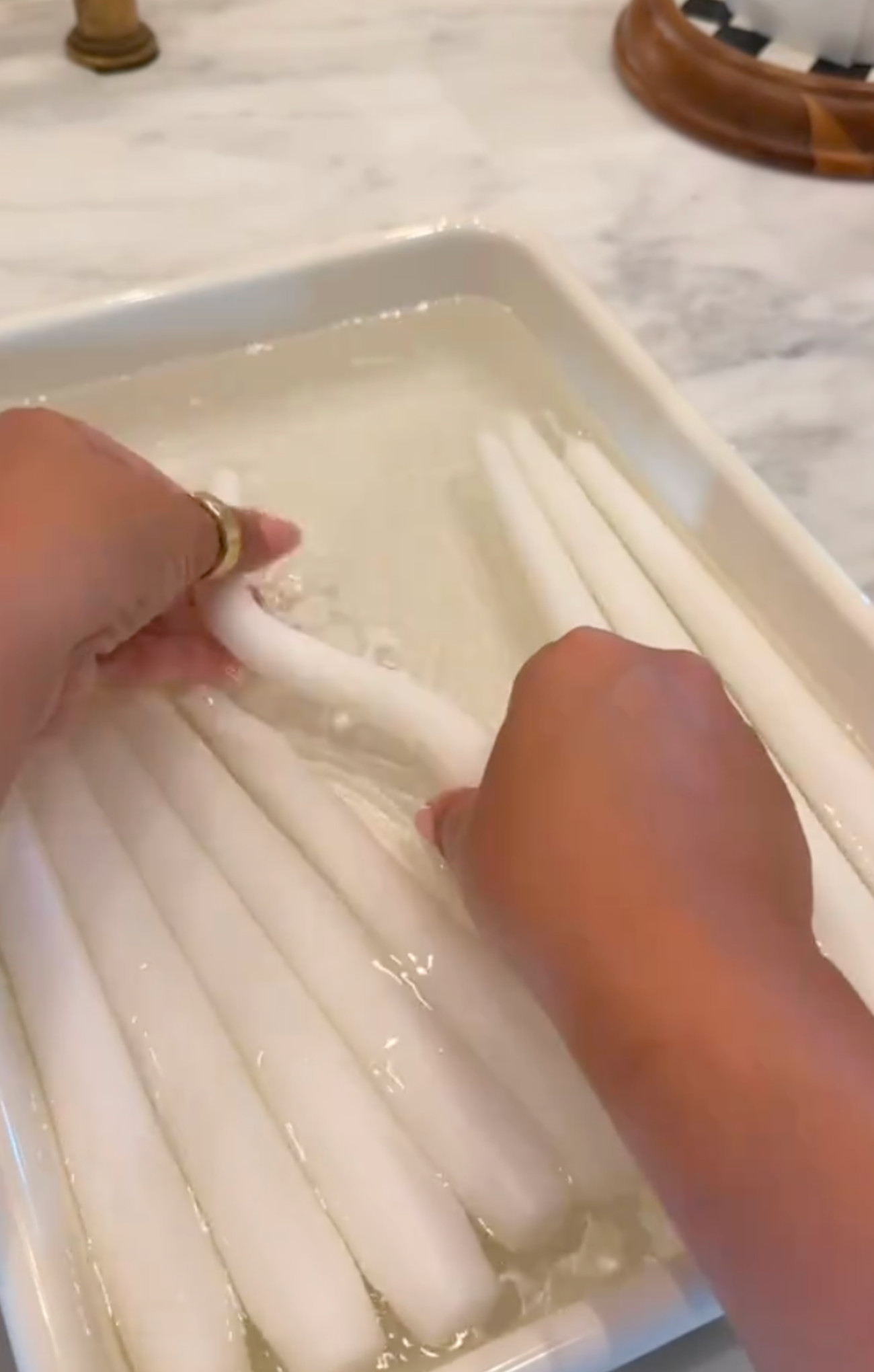 Add water to a 9×13 baking dish and submerge the candles in the water. You might have to press them down into the water with your hands to prevent them from springing back up to the surface.