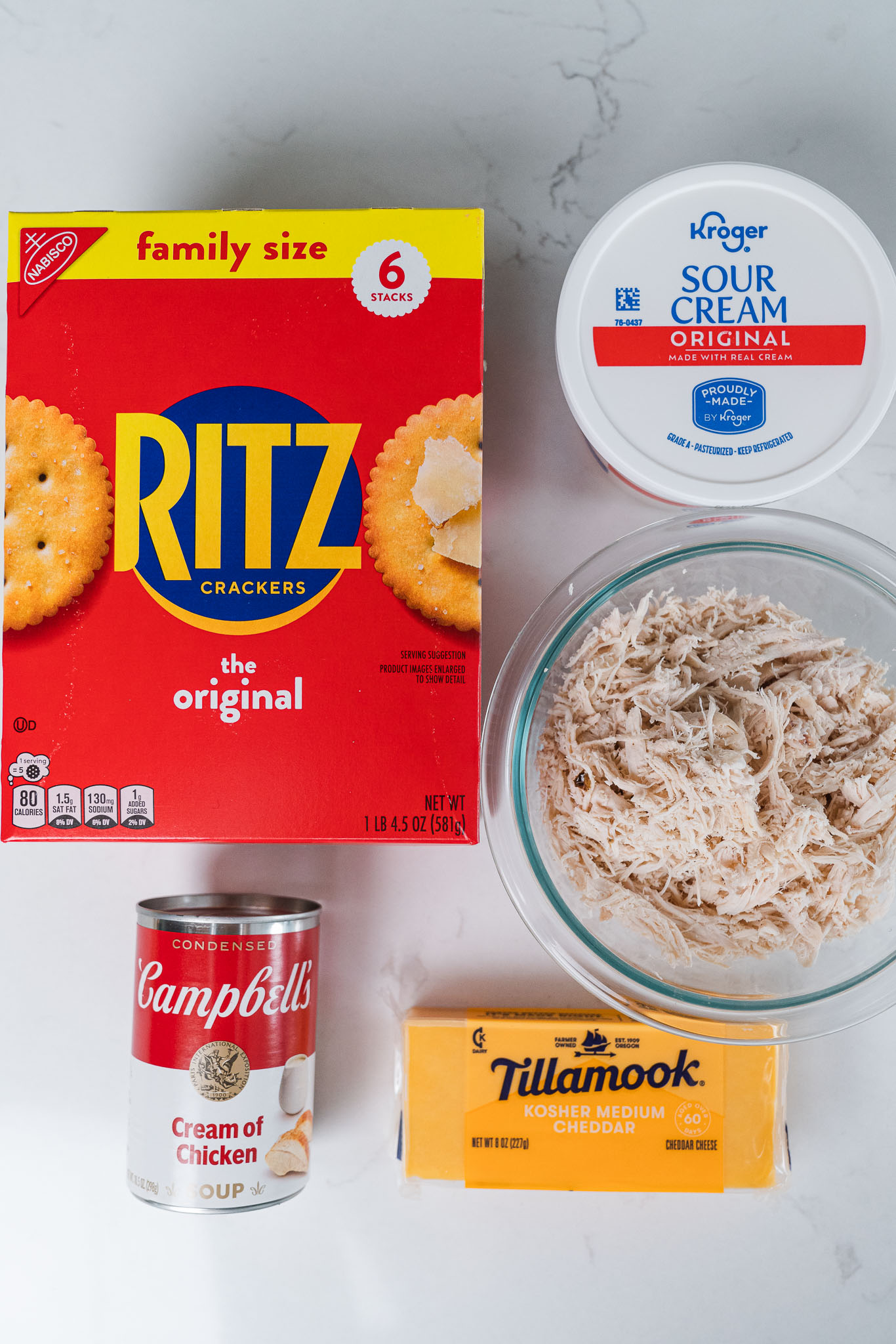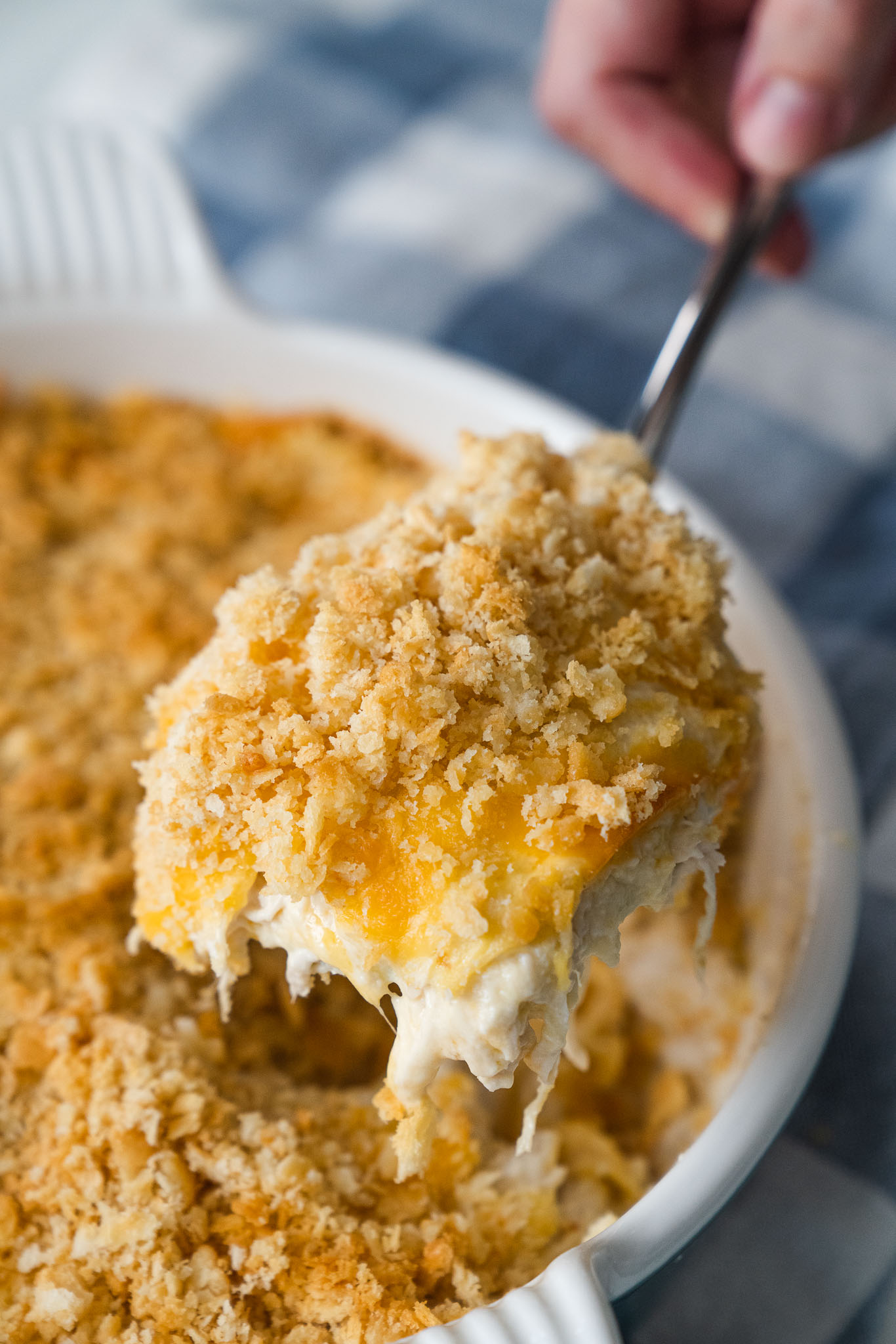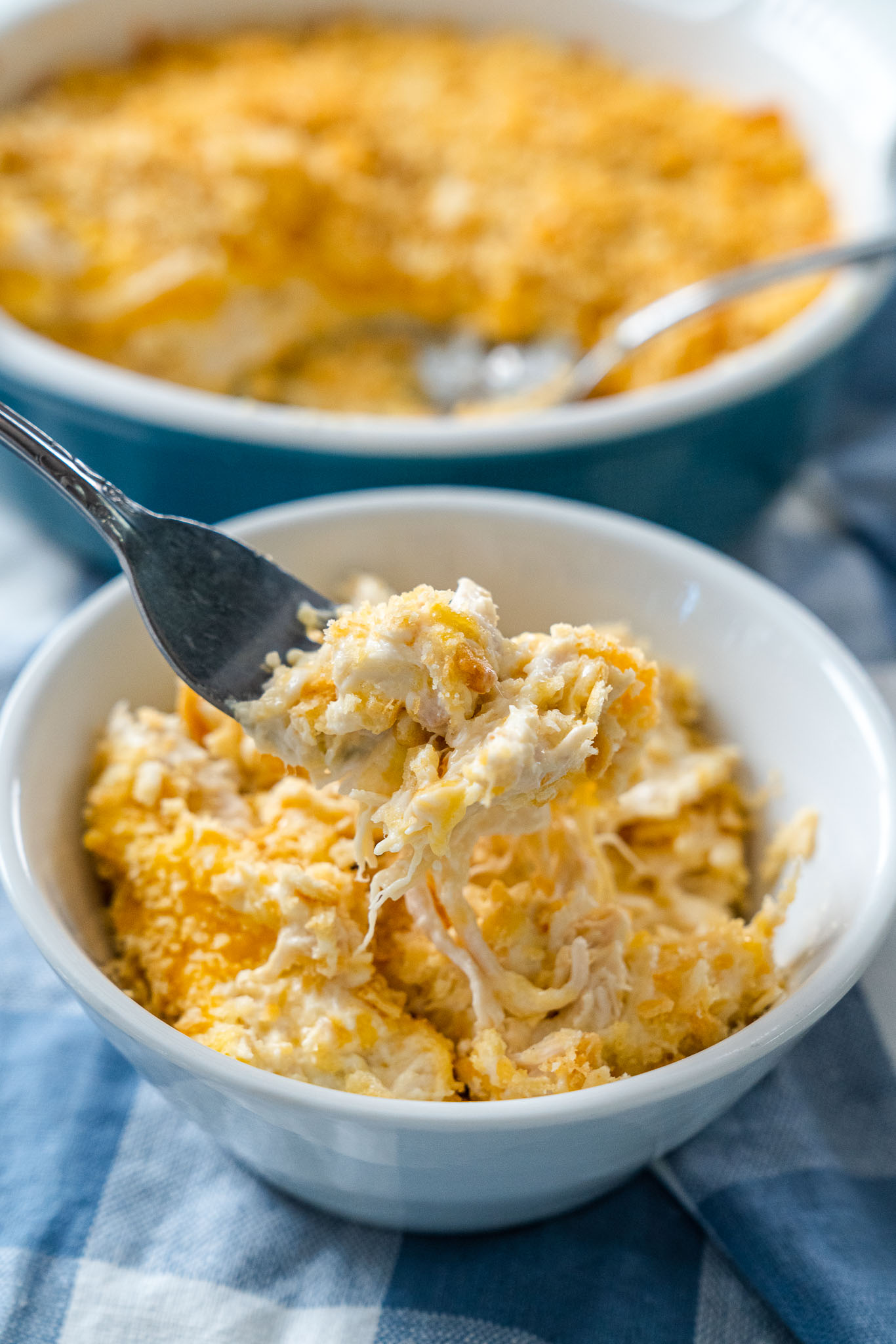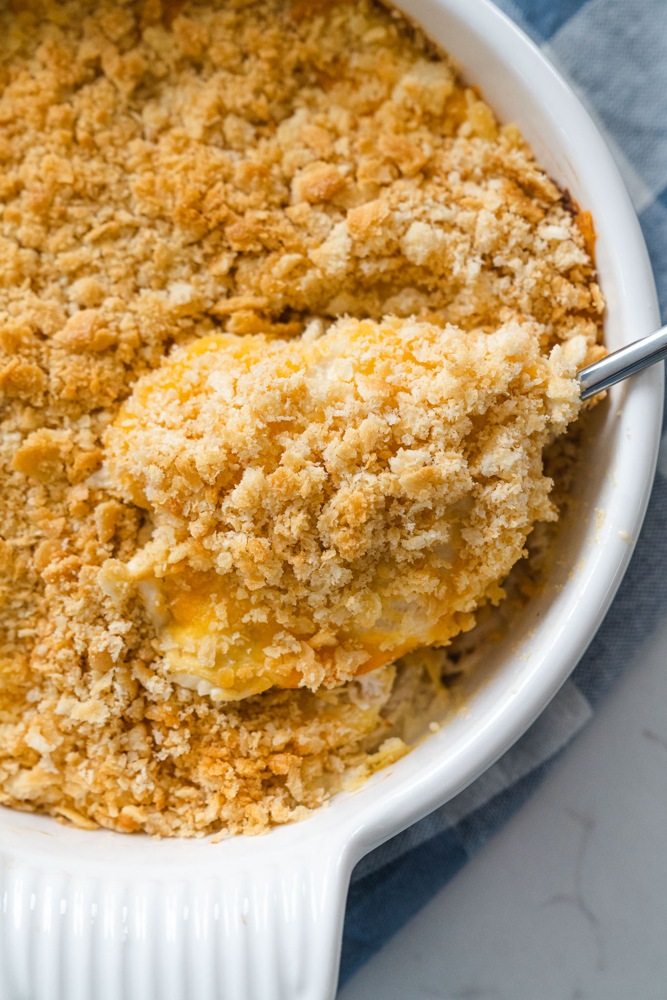 - Spread out half of the chicken mixture in the baking dish, top with half of the cheese. Top with remaining chicken, followed by the remaining cheese, and the crushed crackers.