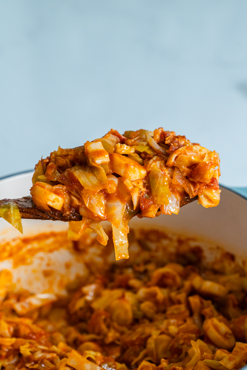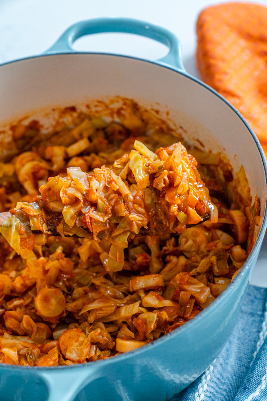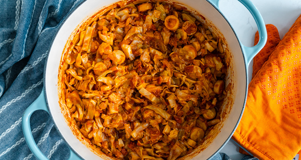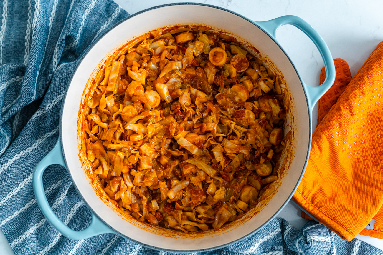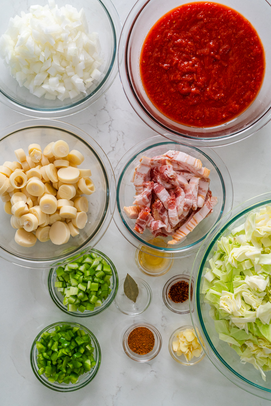 The Cajun trinity works alongside bacon to create a super flavorful base. Everglades seasoning is a specific regional Florida spice company, but you can simply substitute it with Cajun seasoning. The cabbage, crushed tomatoes, hearts of palm, and bay leaf are added and simmered until the hearts of palm are cooked through and the cabbage is wilted.