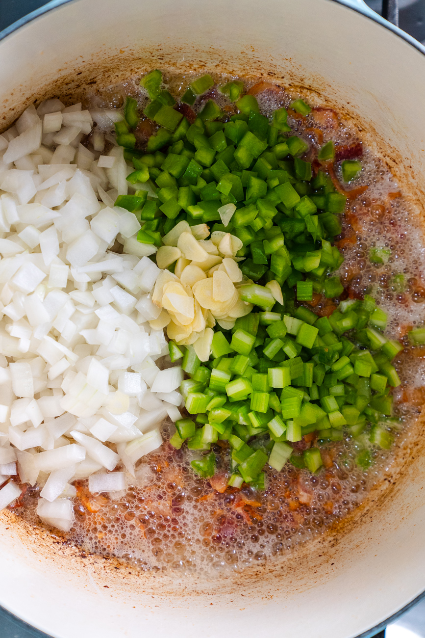 - Add the onions, bell pepper, and celery to the pot and cook until softened and lightly brown, about 8 minutes.