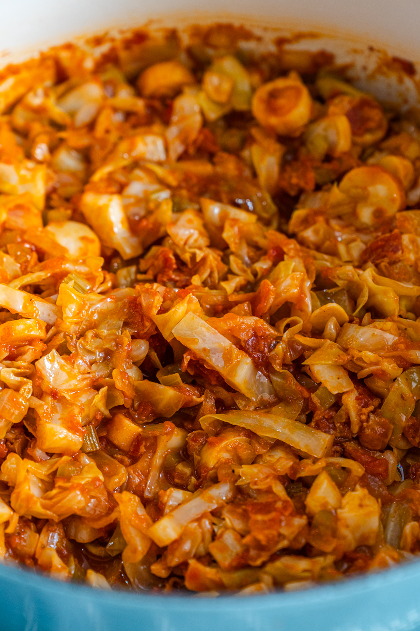 - Stir in the cabbage, tomatoes, and bay leaf. Reduce heat and cook, covered, until cabbage is just becoming tender, about 20 minutes. Stir occasionally to prevent burning.