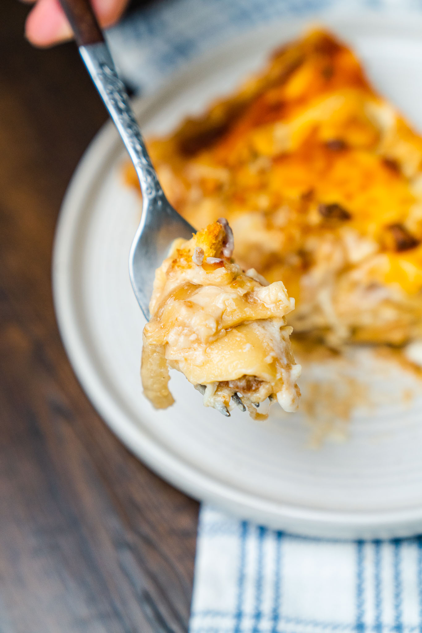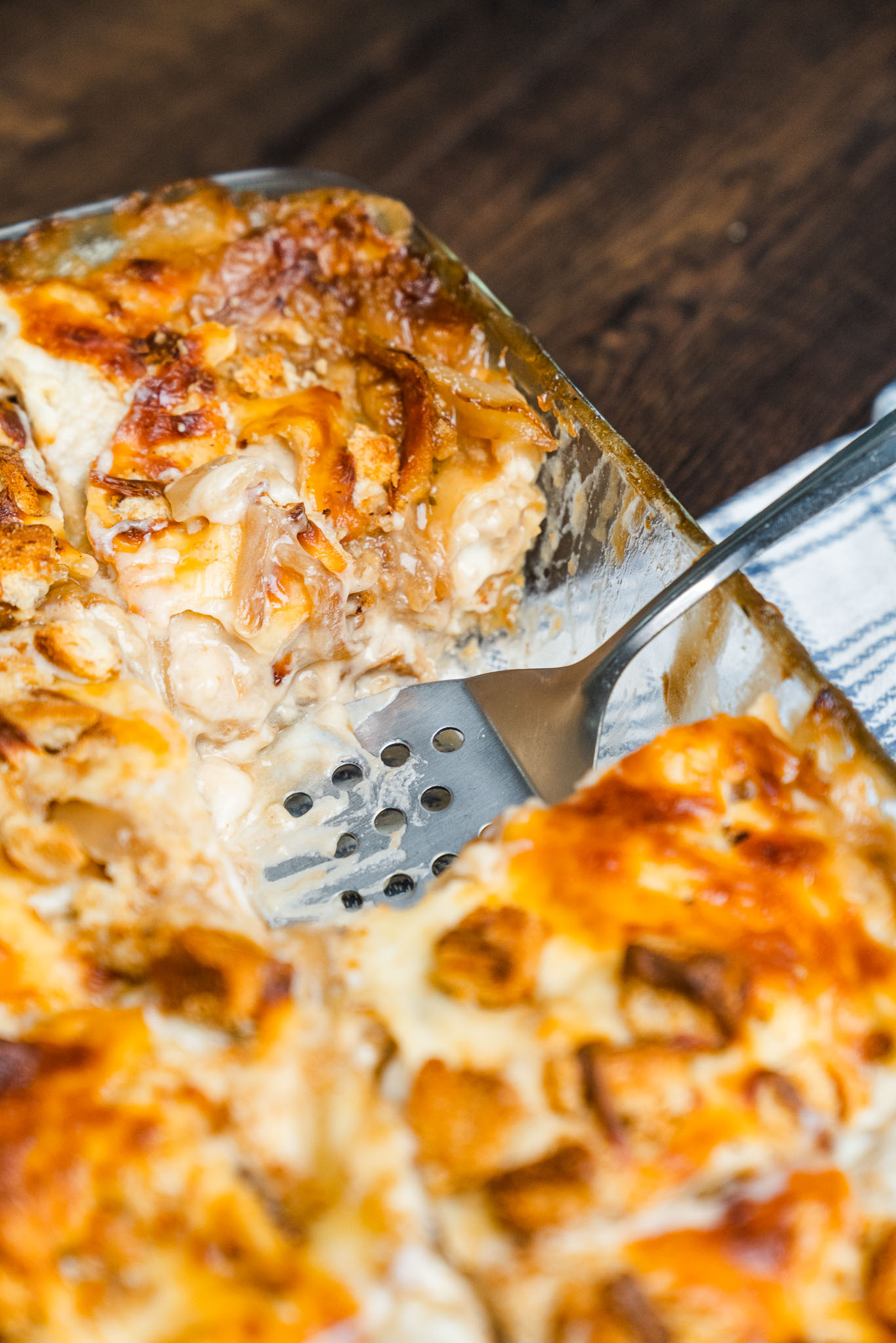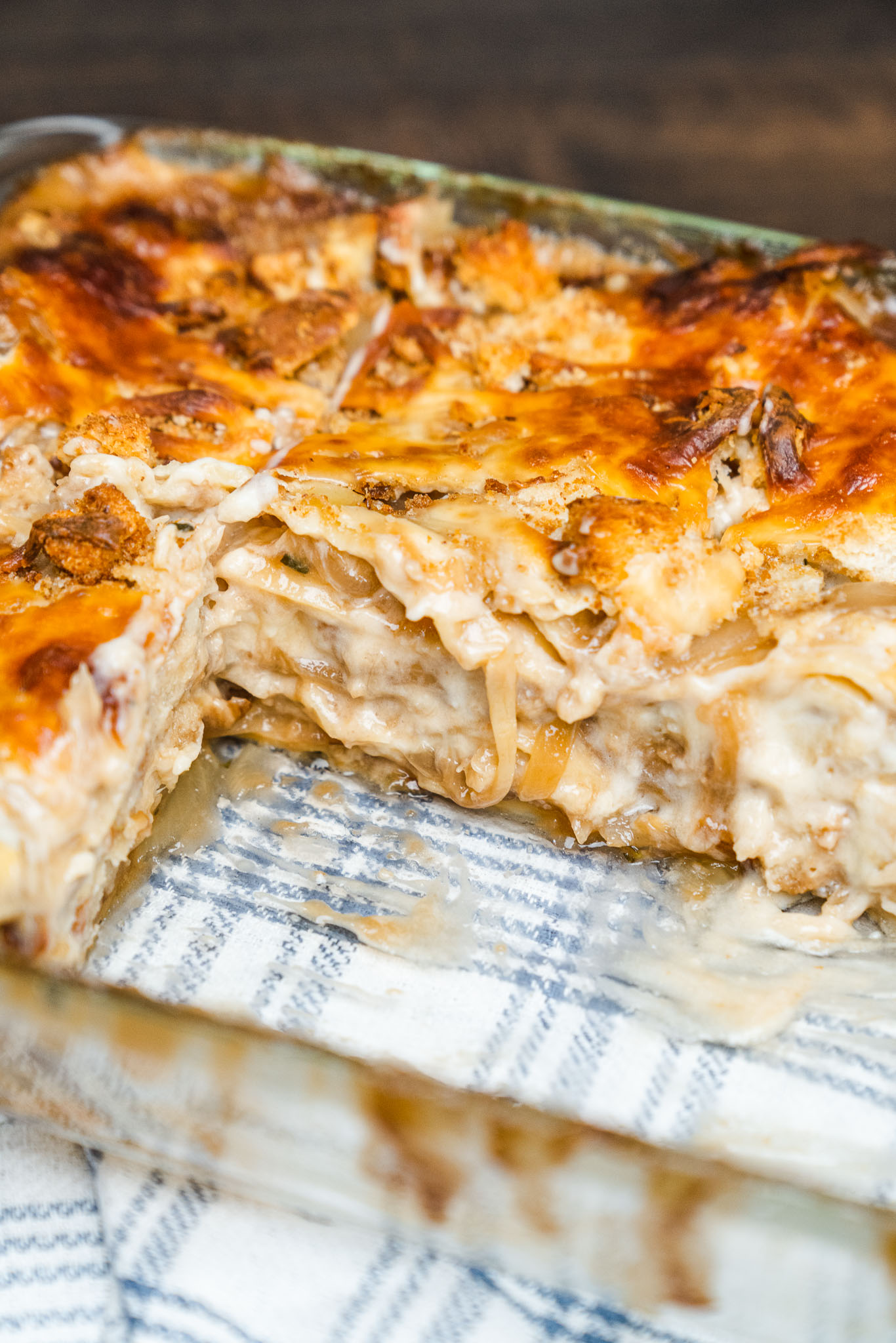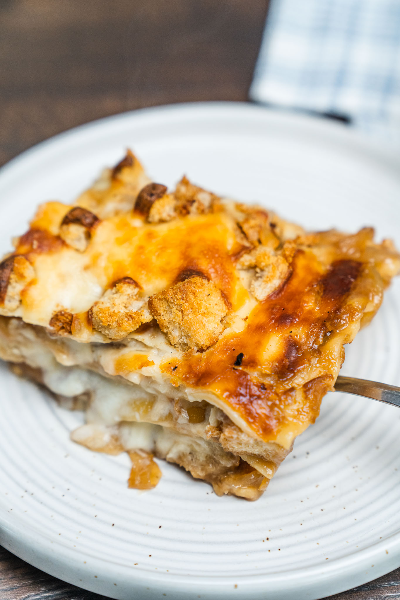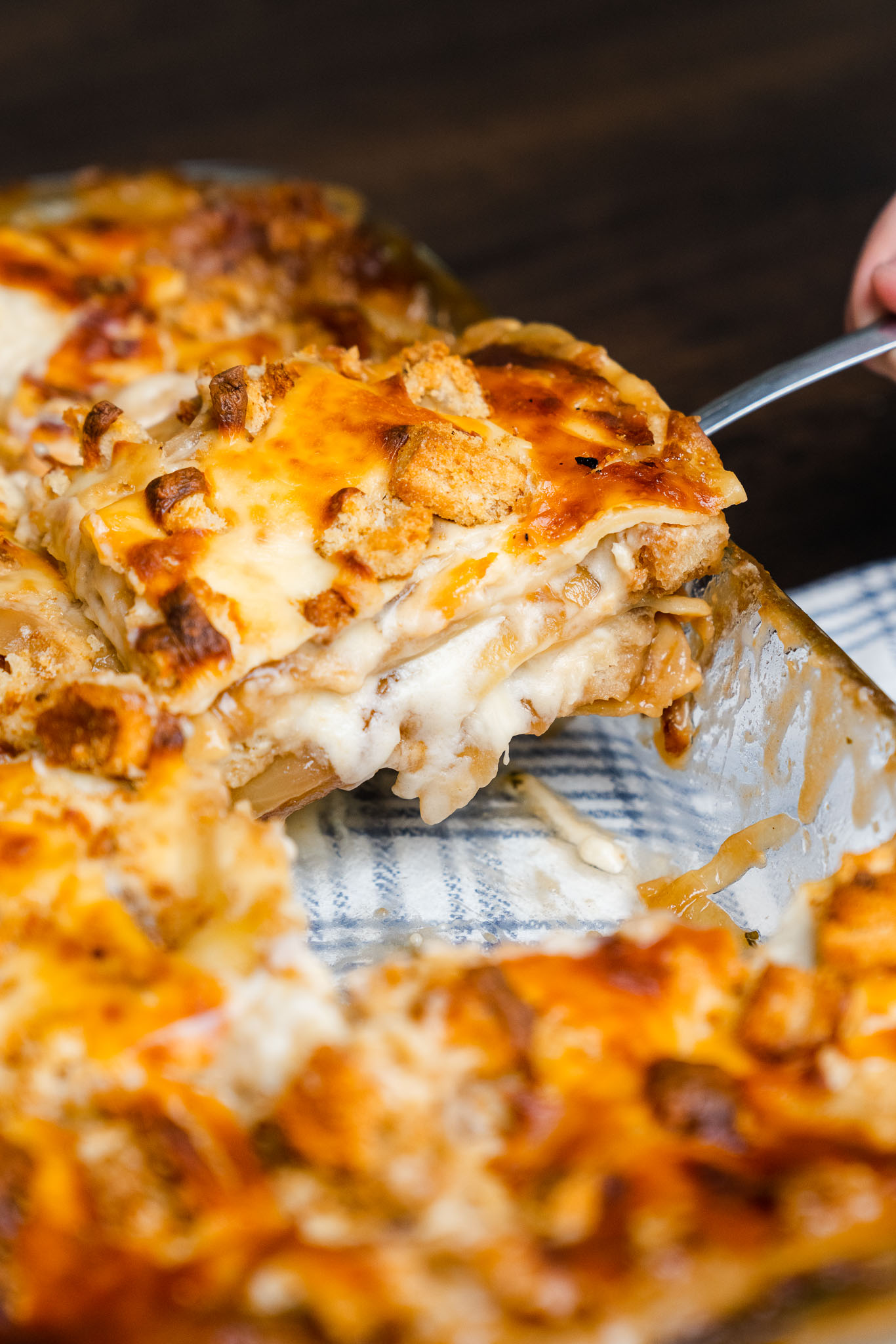 After this lasagna comes out of the oven the house is perfumed with the smell of a French cafe. Slice into the lasagna after it’s rested and take a peak at the beautiful layers you’ve created with the onion gravy and gruyere cheese sauce. The croutons add a crunchy topper and meaty filler, that can easily pair well with a sausages or roasted chicken. A lasagna side dish? Yes please!