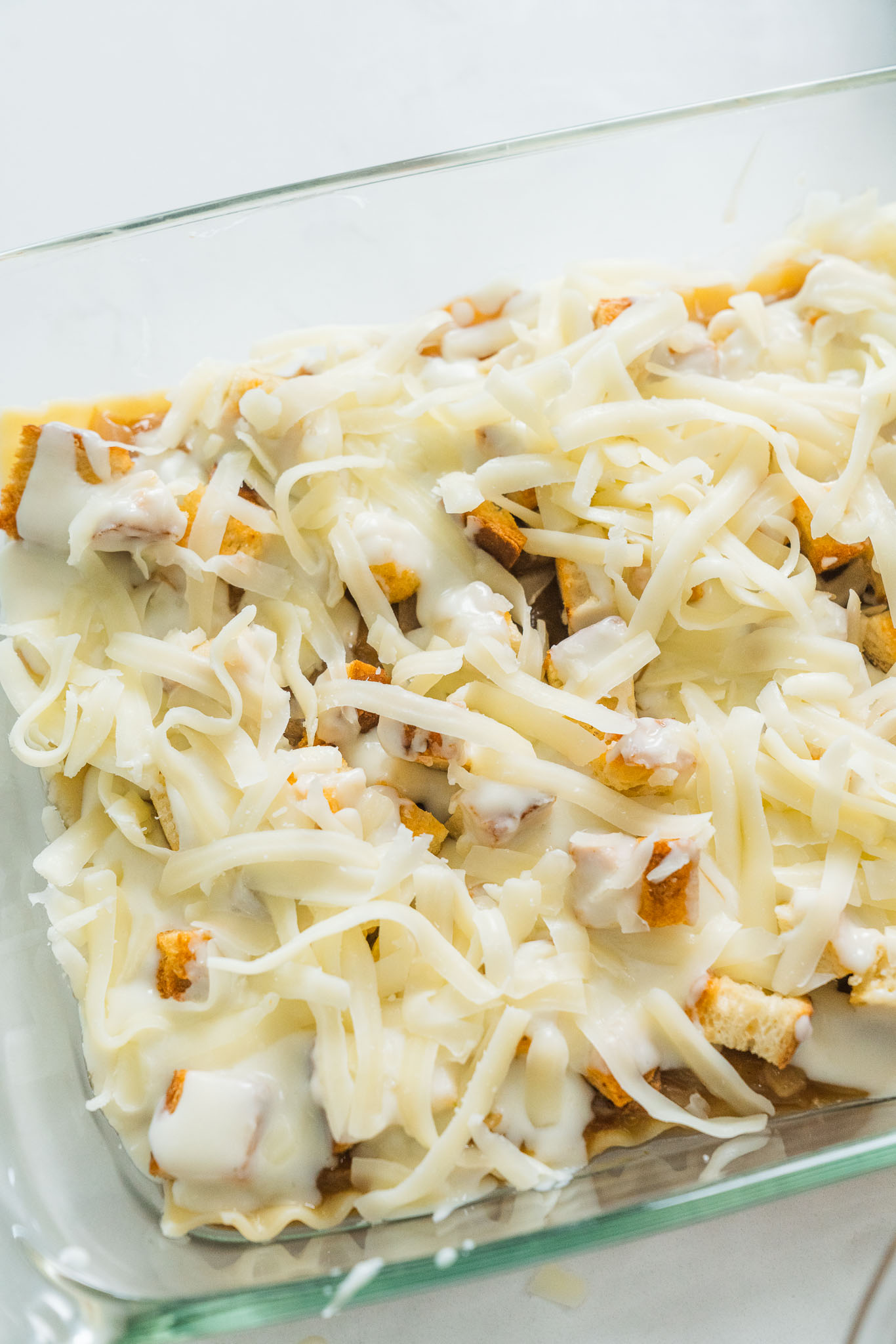 The components of this lasagna include a cheese sauce, a gravy, and a topping of homemade sourdough croutons. It may seem like a double standard to have carbs on carbs, but it’s lasagna. It’s a carb-heavy meal. I can’t think of a French onion dish without a crispy bread element. The croutons were rather large, so I did end up crushing them with my hands when sprinkling them into the layers. Next time, I think using sourdough breadcrumbs may be the better move for the final presentation and dispersal in the lasagna.