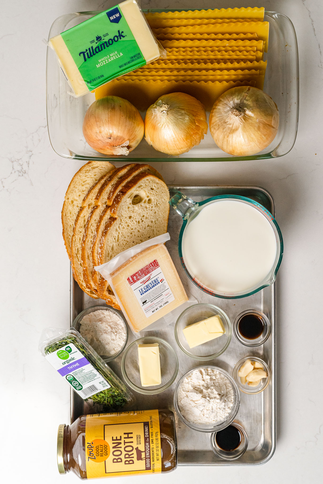 The next component is the Gruyere cheese sauce. It’s a classic addition to the baked soup and feels necessary in our cheese sauce. This replaces the need for a ricotta filling and red sauce. This is a white lasagna. The cheese sauce is exquisite, when combined with the croutons and onion gravy. It ties the whole thing together. I want to keep the integrity of lasagna and French onion soup here, which means a broth onion flavor with a creamy sauce to act as that caramelized cheese on top of the soup.