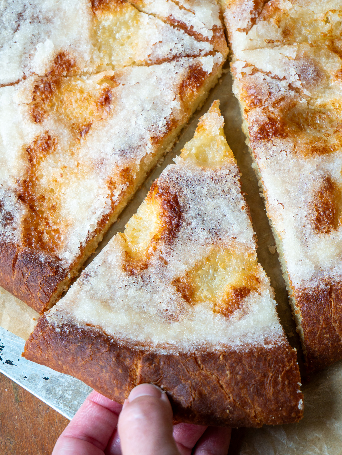 A great question. Galette generally means “flat cake” and often refers to free-form tarts that encase fruit or other filling. This one is a yeasted dough that’s closer to a bread dough than pastry and has a filling that’s really more of a topping and is only comprised of butter and sugar. It’s deliciously simple with a chewy yet crusty base, the slightest hint of lemon, and a sugary crust that tops it all off. It’s not overly sweet and is the kind of thing that works for an afternoon snack (what the French call ‘le goûter’) as well as it does for dessert.