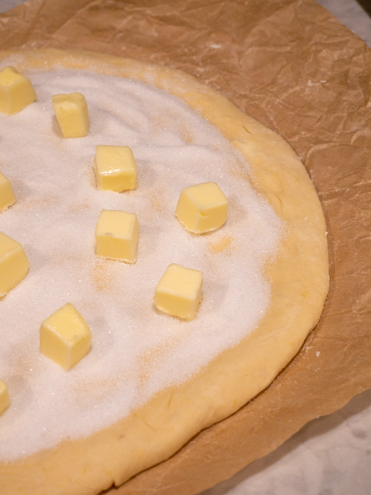 - Sprinkle remaining sugar over the dough and dot with the remaining butter.
