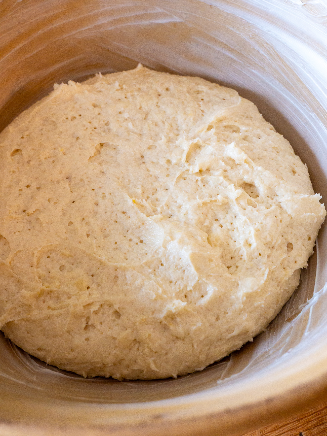 You just want to mix up the water and yeast and let it rest while you mix together the softened butter, egg, lemon zest, and just a touch of sugar. Next, you’ll work in the flour but that’s easily done with a wooden spoon. The yeast mixture goes in next and pretty soon you’ll have a very soft and moist dough. You’ll want to place it in a butter-greased bowl, cover it, and let it sit until it doubles in size, which will take about two hours.